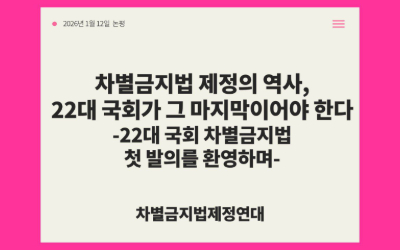 차별금지법 제정의 역사, 22대 국회가 그 마지막이어야 한다 -22대 국회 차별금지법 첫 발의를 환영하며- 2026년 1월 9일, 진보당 손솔의원의 대표발의로 22대 국회에서 드디...- 2026-01-13