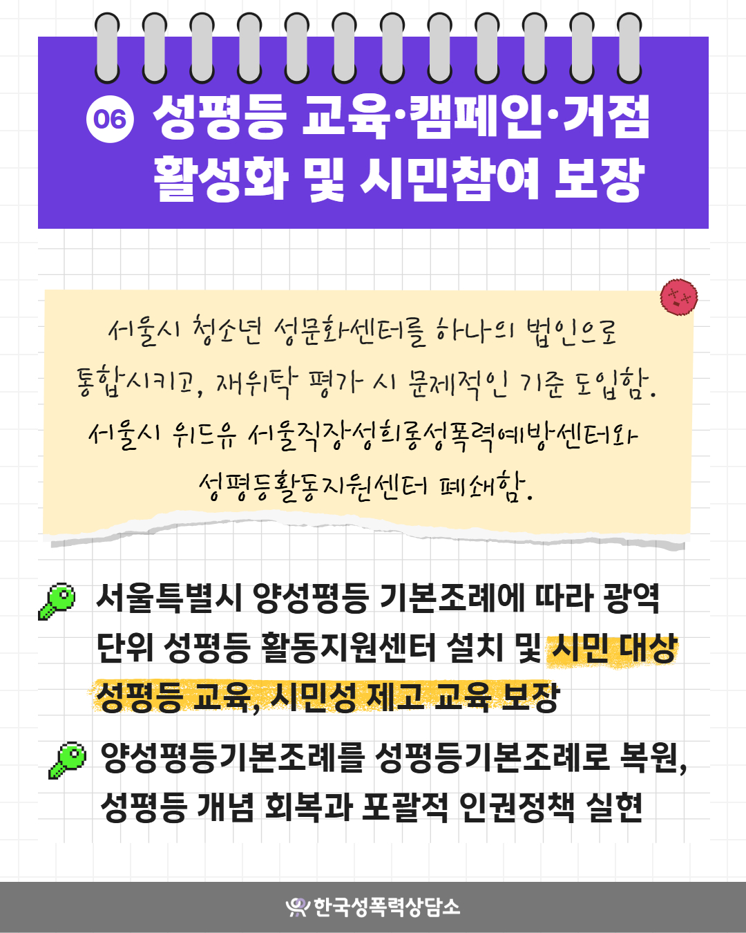 🔑 서울특별시 양성평등 기본조례에 따라 광역 단위 성평등 활동지원센터 설치 및 시민 대상 성평등 교육, 시민성 제고 교육 보장