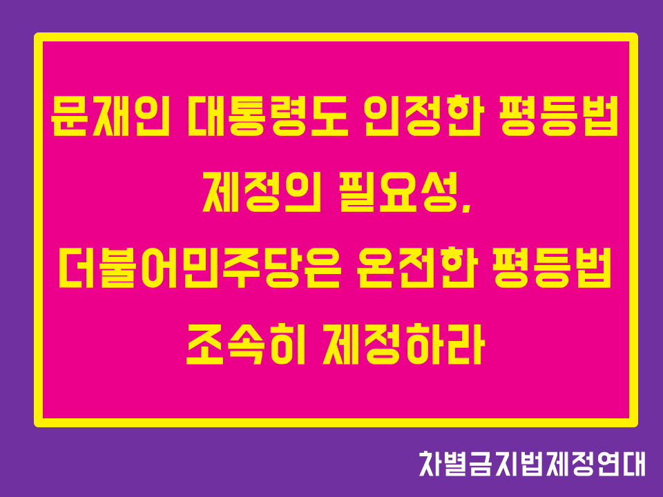 8년만의 민주당 발의 환영한다. 국회는 연내 차별금지법/평등법 제정을 위한 논의에 지금 바로 착수하라. 차별금지법을 제정하라는 시민의 요구에 더불어민주당에서 응답이 시작되었다....- 2021-06-16