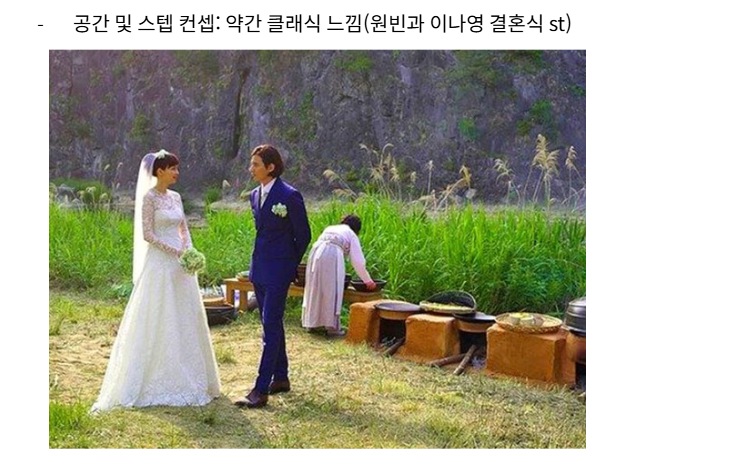 (사진설명) 공간 및 스탭 컨셉: 약간 클래식 느낌(원빈과 이나영 결혼식 st)이라고 적혀있고 아래에 원빈과 이나영의 결혼식 사진이 있다.