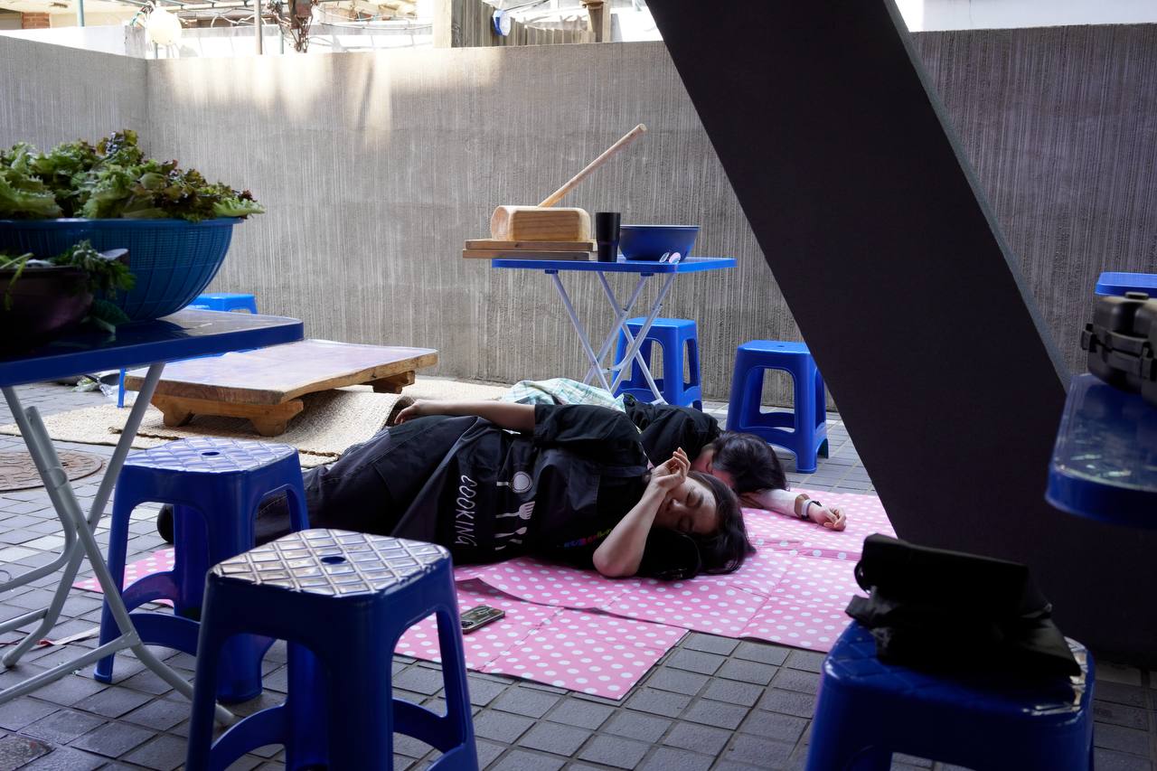 주말에 장을 봐서 야채와 식재료들을 구입하고 당일 아침부터 분주히 요리를 손질하기 시작했습니다. 잔칫상에 음식이 모자라지 않게 해야한다는 동아시아의 오랜 관념이 작동했습니다. 끊임없이 야채를 썰고 다듬는 활동가들이 끙끙대는 소리가 들렸지만 부엌 총괄을 맡은 조*희와 겔* 활동가의 당근과 채찍 덕분에 식재료 손질을 마칠 수 있었습니다. 고된 노동에 지친 활동가 중 몇명은 점심시간을 틈타 세팅된 테이블 사이에 돗자리를 펴고 낮잠을 청했습니다.