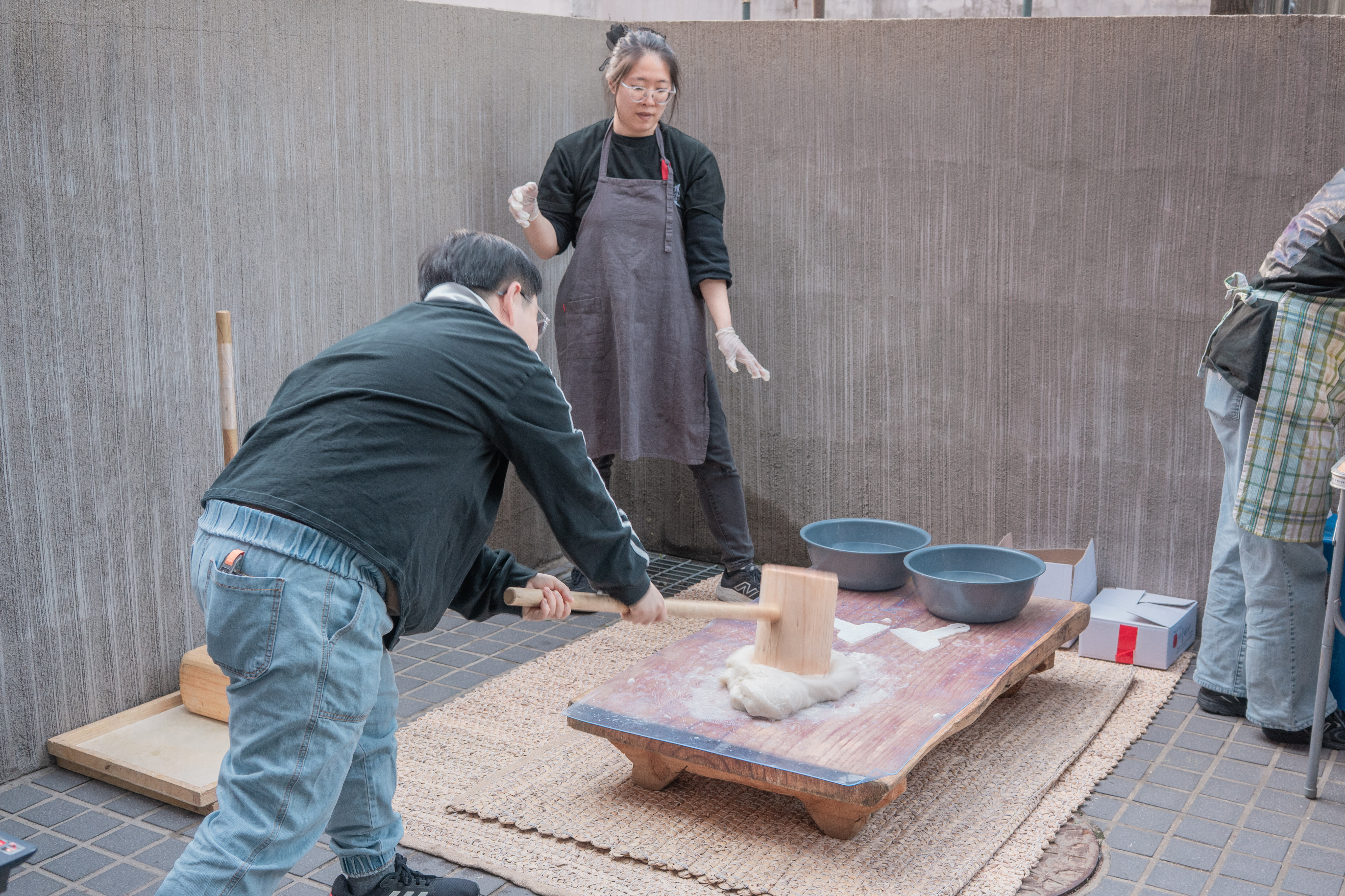 (사진설명) 한 참여자가 떡판 위에 올려진 떡 덩어리를 떡매로 내리치고 있다.
