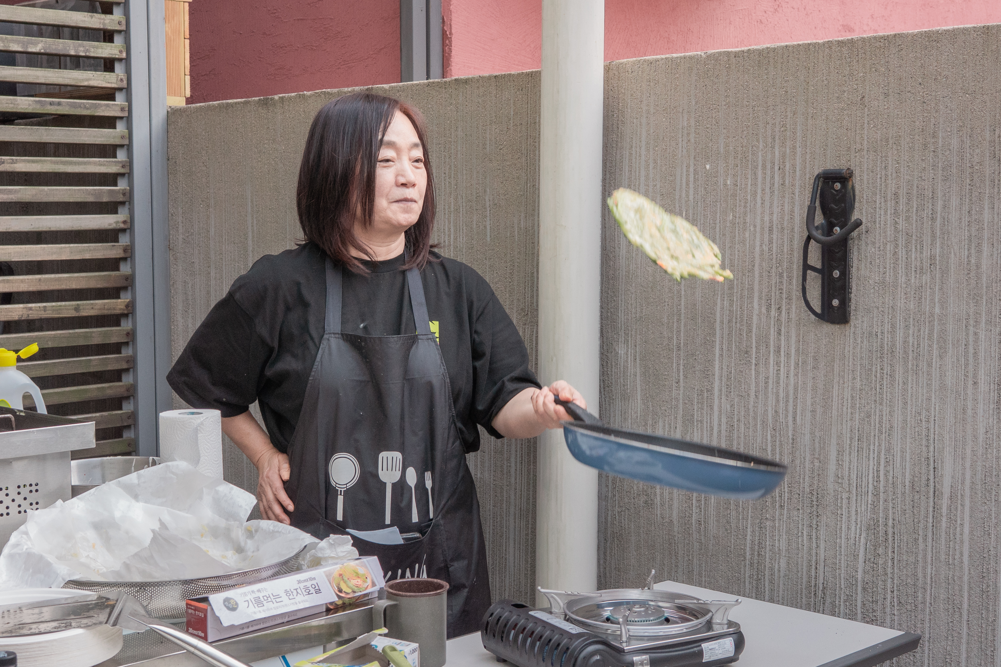 (사진설명) 활동가가 후라이팬으로 전을 부치고 있다. 후라이팬 위에 전이 공중에 띄워져있다.