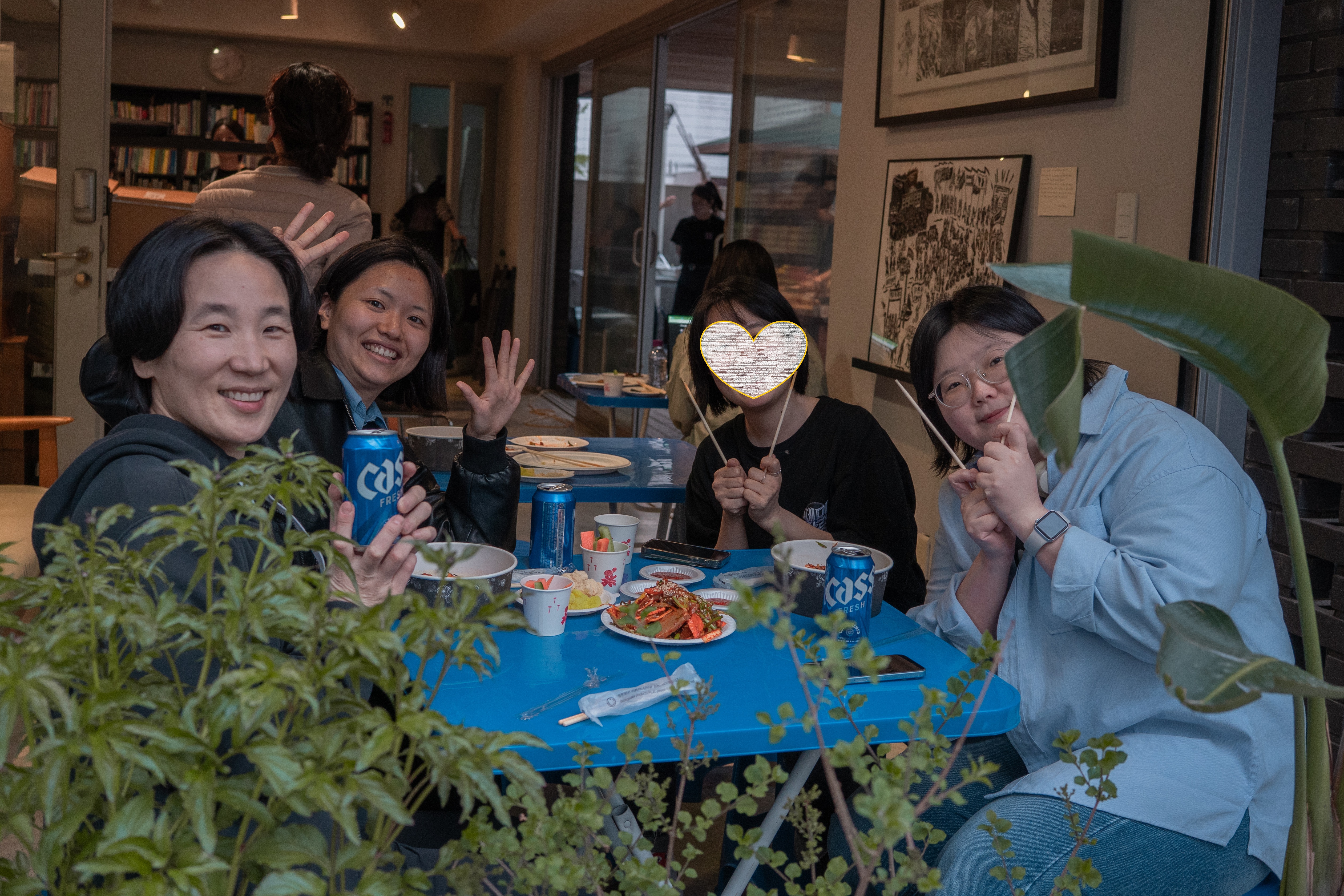 삼삼오오 찾아오신 분들이 테이블에 앉아 준비한 음료를 먹고 마시며 즐거운 시간을 보냈어요. 한분은 직접 담그신 매실주를 선물로 주셨고 술을 좋아하는 활동가와 손님들이 즐겁게 나누어 마셨습니다. 메세지로 소식을 본 회원분들, 인근을 들렀다가 SNS를 보고 번개처럼 찾아온 팔로워, 여러 이웃 단체의 활동가, 동네 이웃분들이 모두 자리에 함께해주었습니다.