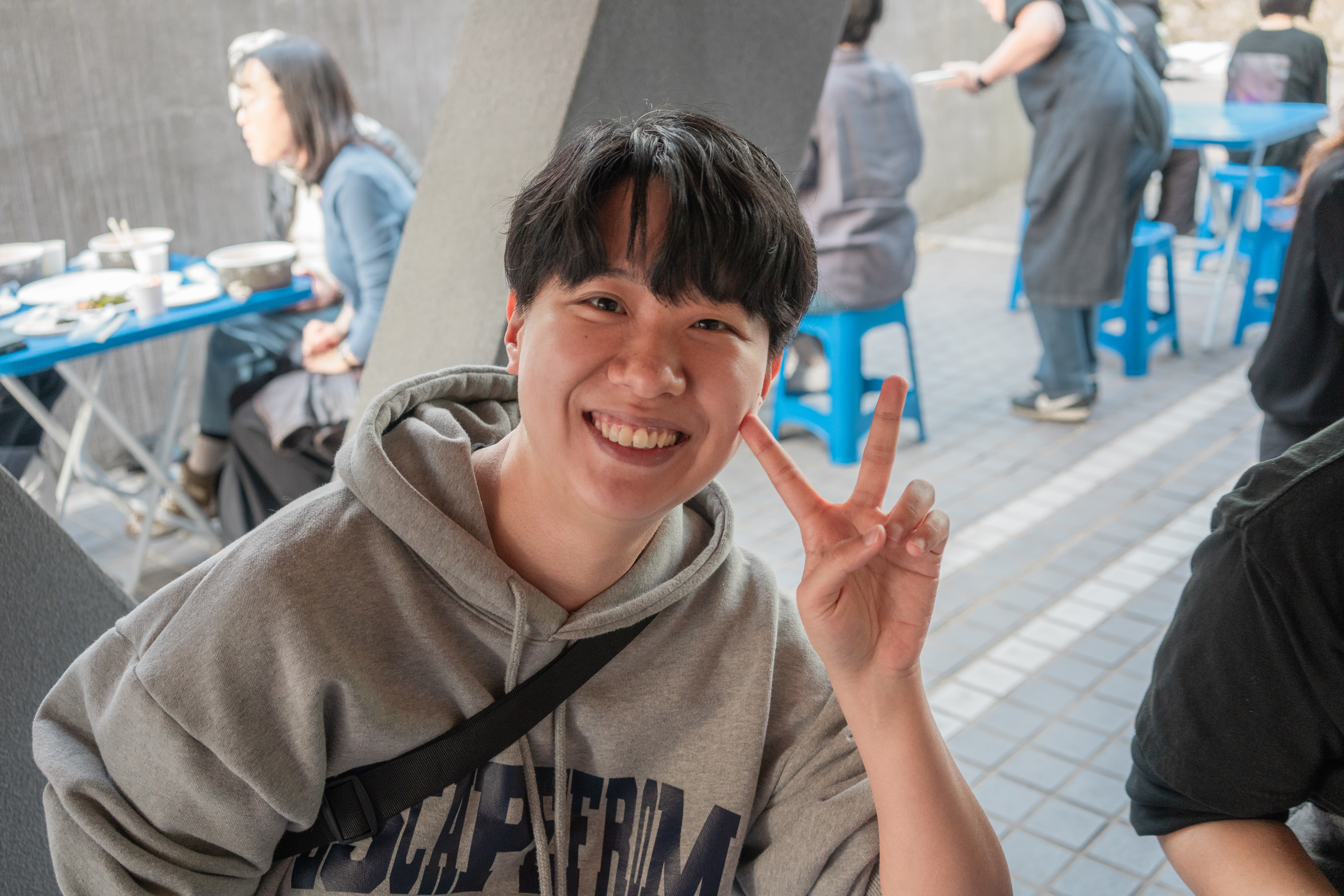 (사진설명) 회색 후드티를 입은 참여자가 카메라를 보고 손으로 v를 그리며 환하게 웃고 있다.