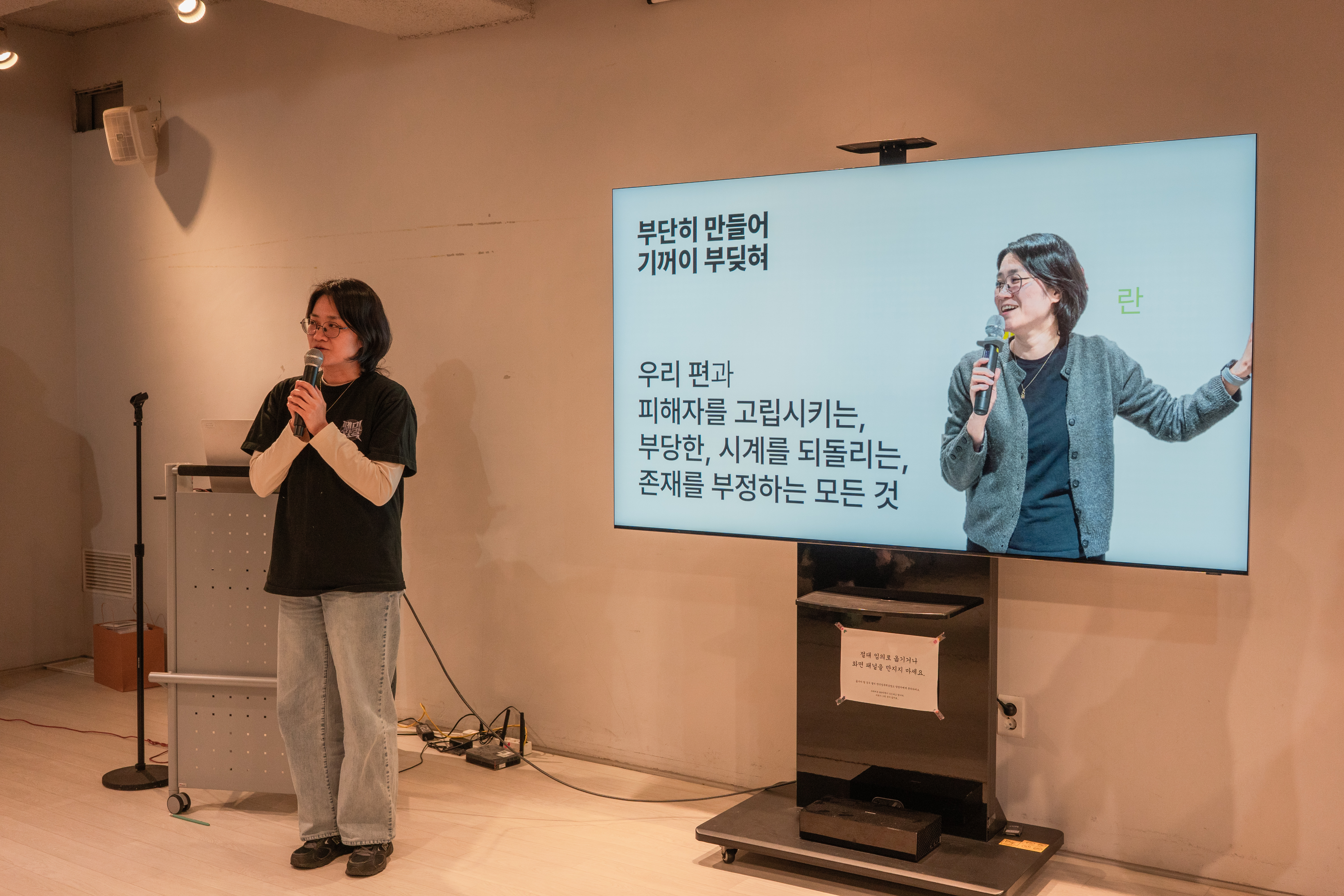 (사진설명) 란 활동가가 마이크를 잡고 발언하고 있다. 옆에 TV모니터에 "우리편과 피해자를 고립시키는, 부당한, 시계를 되돌리는, 존재를 부정하는 모든 것" 이라고 적혀있다.