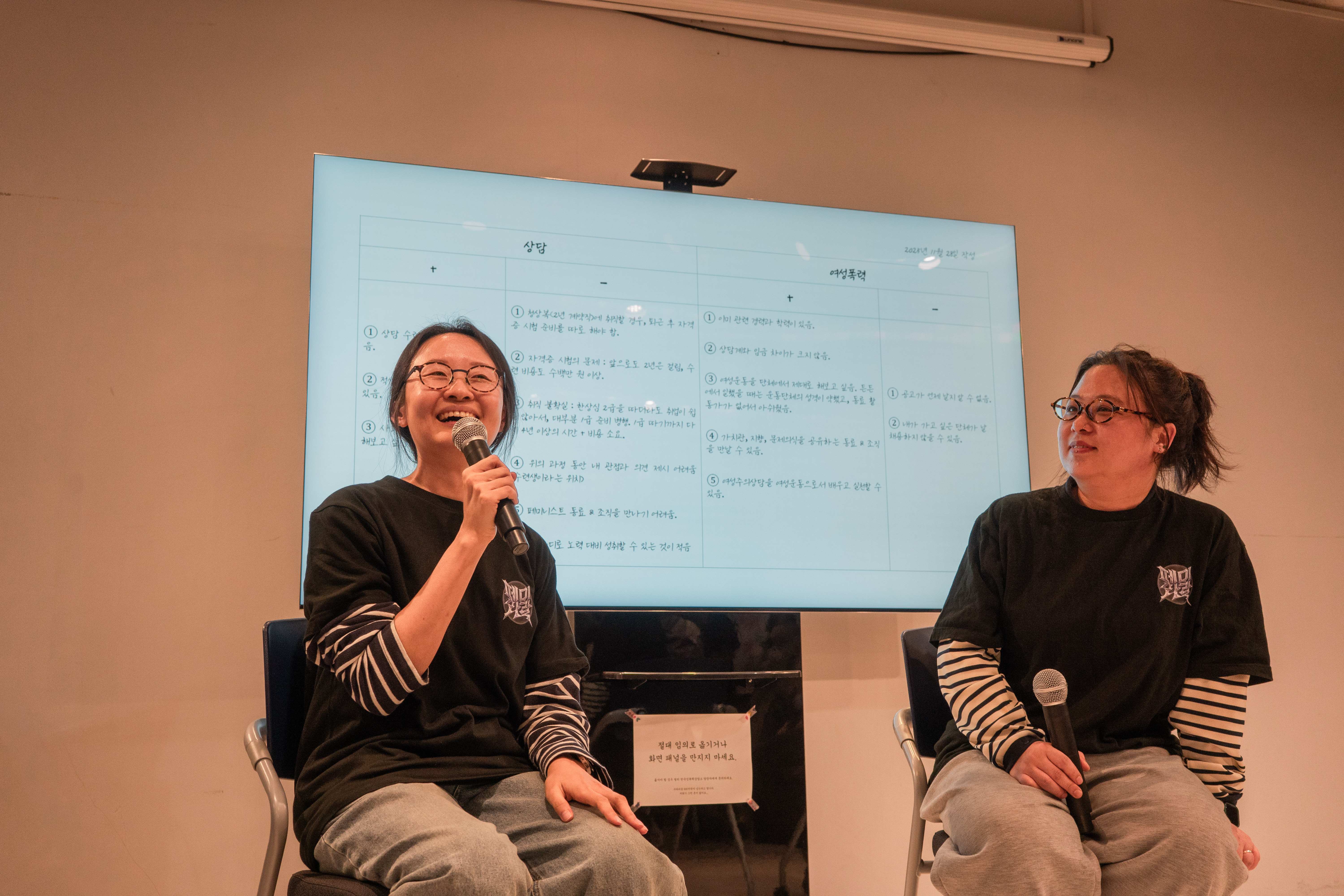 ‘만들고 부딪혀 온 사람들’이라는 주제로 진행된 활동가 토크는 자원활동가에서 상근활동가가 되고 열림터의 원장으로 환갑을 맞게 된 으니조의 이야기, 상담소의 가장 최근 입사자 유림, 살아온지 35년차를 지나고 있는 봄눈별이 상담소에 함께하게된 각자의 이야기와 활동하며 ‘부딪힌’ 순간들에 대해 이야기를 나눠주었습니다. 유림은 상담소에 입사하기전에 상담과 여성폭력 중 경로를 고민하며 대차대조표를 만들었다고 합니다. 여성폭력 활동을 하는 것의 단점은 "공고가 언제 날지 알 수 없고, 내가 가고 싶은 단체가 날 채용하지 않을 수 있다"는 것이었다고 해요. 다행이 상담소의 활동가로 함께하며 단점이 사라졌네요~ (유림 다시한번 환영해요)