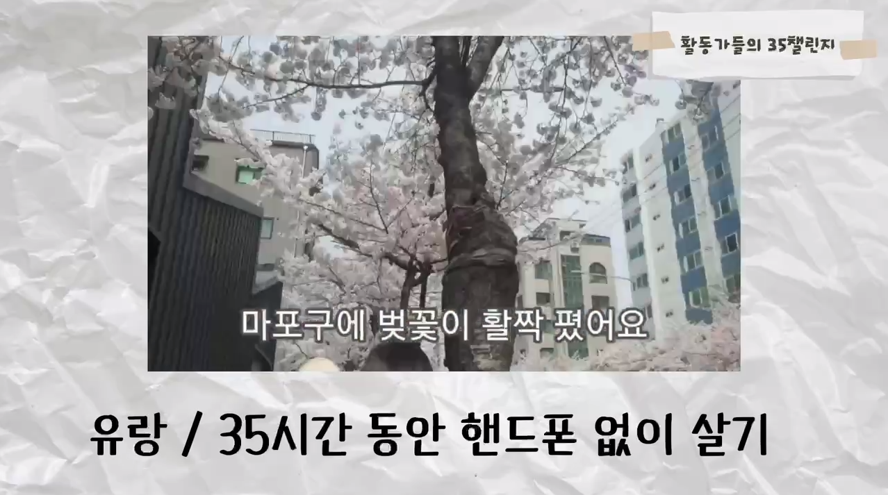 (사진설명) 활동가들의 35챌린지 영상의 일부. 벚꽃 사진에 "마포구에 벚꽃이 활짝 폈어요"라는 자막이 있다. 그 밑에 "유랑 / 35시간 동안 핸드폰 없이 살기"라고 적혀있다.