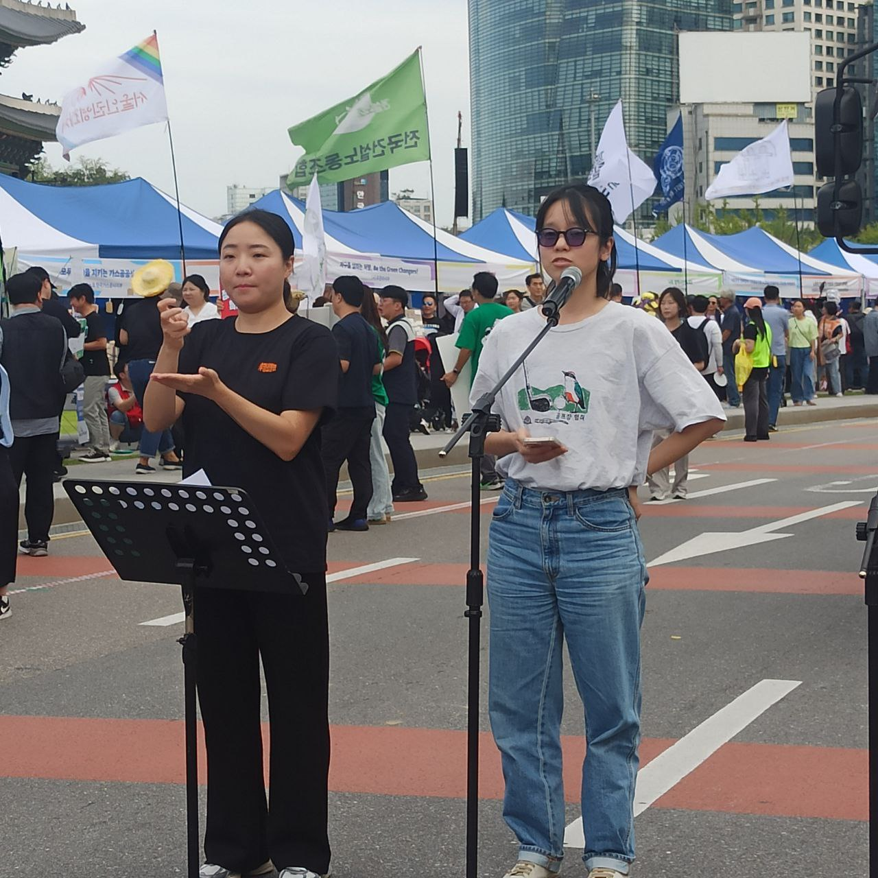 한국성폭력상담소 활동가이자 차별금지법제정연대 활동 중이며, 5년차 옥상 농부 수수가 오픈마이크를 통해 연대했습니다. 수수 활동가는 “같이 사는 친구와 옥상에서 무화과를 키우며, 날씨가 매해 이상해지는 것을 체감한다”고 말했습니다. 더워야 할 때 춥고, 추워야 할 때 덥고, 비가 영원히 내리거나 영원히 오지 않는 기후가 우리의 일상을 뒤흔든다는 것입니다. 또한 기후재난은 불평등을 증폭시킨다고 강조했습니다. 여성농민은 작은 규모의 영농으로 더 큰 피해를 입고, 지구온도가 1도 오를 때마다 전 세계 친밀관계폭력이 4.7% 증가한다고 했습니다. 코로나 시기처럼 집에 머무는 시간이 길어질수록 가정폭력·성폭력 피해자들이 더 고립된 사례도 언급했습니다. 수수 활동가는 “기후위기는 곧 차별의 문제”라며, 정부가 민생과 경제를 이유로 차별금지법을 뒤로 미루는 것을 비판했습니다. “차별금지법은 평등을 촉진하고 빈곤과 폭력, 재난을 다루는 정책이며, 이것은 곧 민생과 생존의 문제”라고 발언을 이어갔습니다. 마지막으로 구호를 외치며 발언을 마무리했습니다.