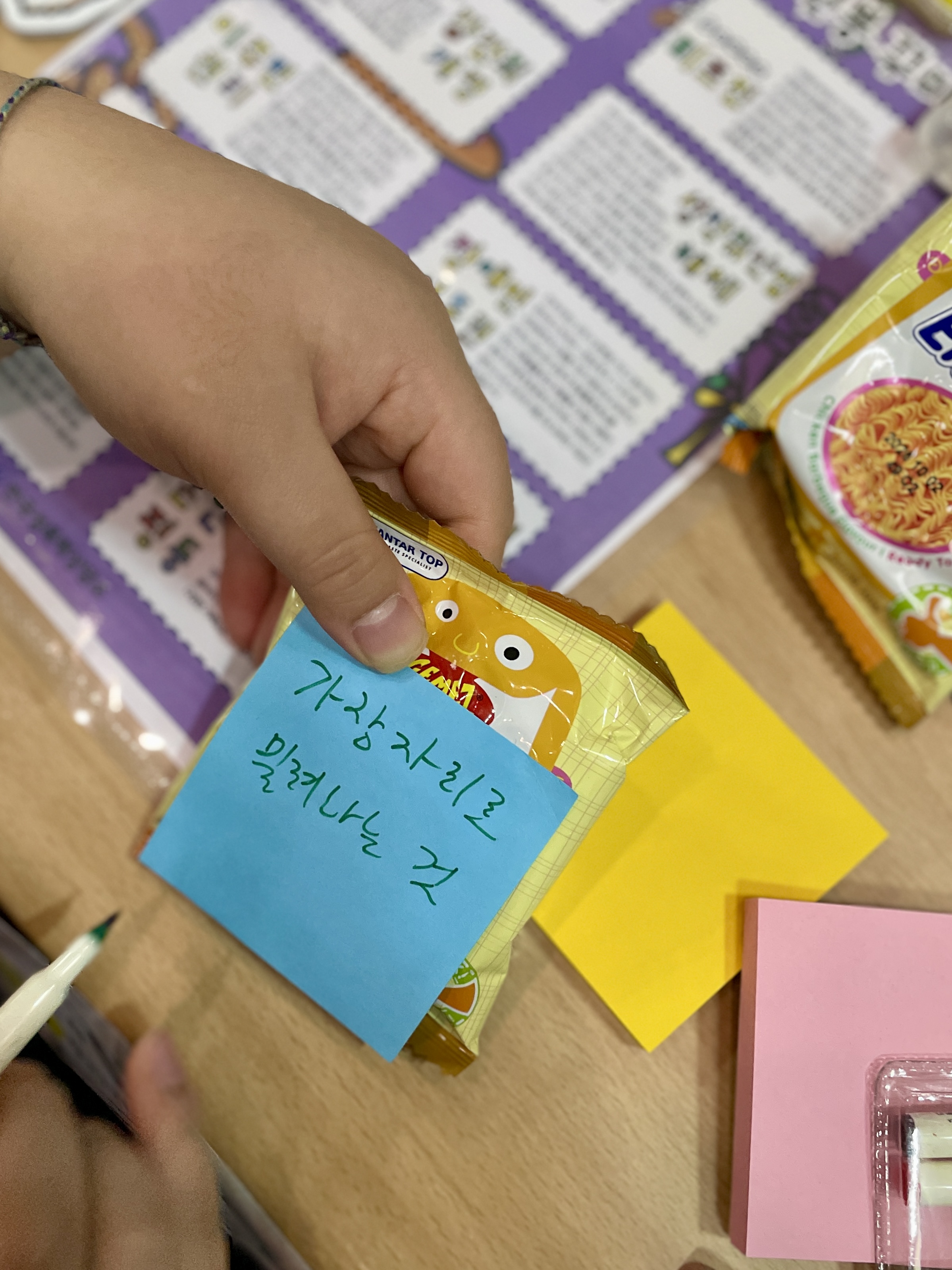 부순 라면을 콰삭콰삭 먹으며 구겨진 포스트잇을 패널에 붙여주셨어요.