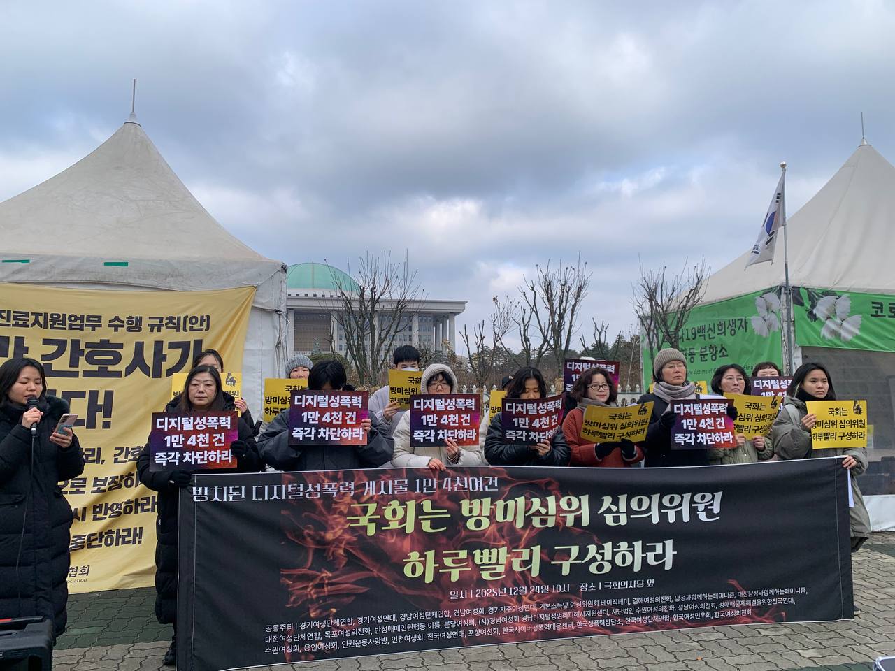 이에 한국성폭력상담소를 비롯한 여성단체들은 2025년 12월 24일 오전 10시, 국회의사당 앞에서 방미심위 심의위원 하루빨리 구성하라고 촉구하며, 젠더관점에 입각한 심의 역할을 요구하였습니다.