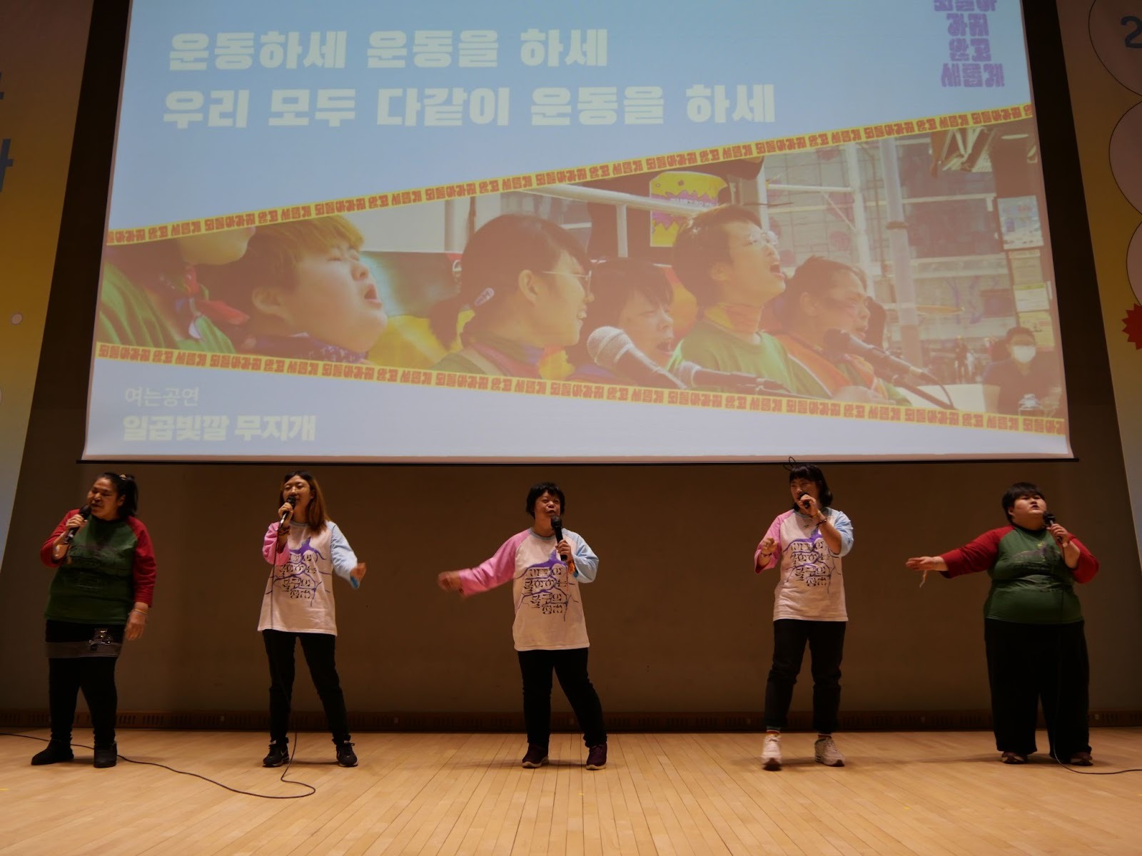 (2026 체제전환운동포럼 여는 공연을 하고 있는 일곱빛깔 무지개의 사진이다. 다섯 명의 사람들이 마이크를 들고 노래를 부르며 흥겹게 팔동작을 하고 있다. 뒤에는 “운동하세 운동을 하세 우리 모두 다같이 운동을 하세”라고 쓰인 PPT가 보인다 - 사진: 체제전환운동포럼 조직위원회)