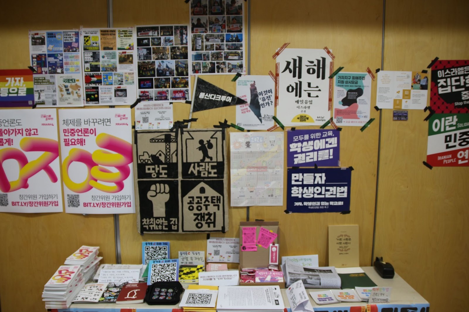 (체제전환운동포럼 발표장 안에 비치된 사회운동 홍보 코너(?)의 모습이다. 다양한 크기와 알록달록한 색깔의 포스터와 피켓, 소책자와 큐알코드 등이 보인다. - 사진: 체제전환운동포럼 조직위원회)