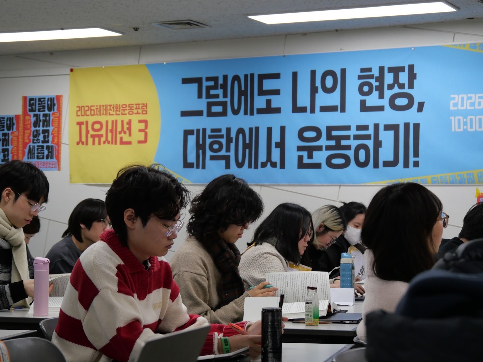 (노란색과 하늘색으로 배색된 현수막이 벽에 붙어 있다. 현수막에는 “2026 체제전환운동포럼 자유세션 3. 그럼에도 나의 현장, 대학에서 운동하기!”라고 쓰여 있다. 그 앞에 청중들이 나란히 앉아서 자료집을 읽고 있다. - 사진: 체제전환운동포럼 조직위원회)