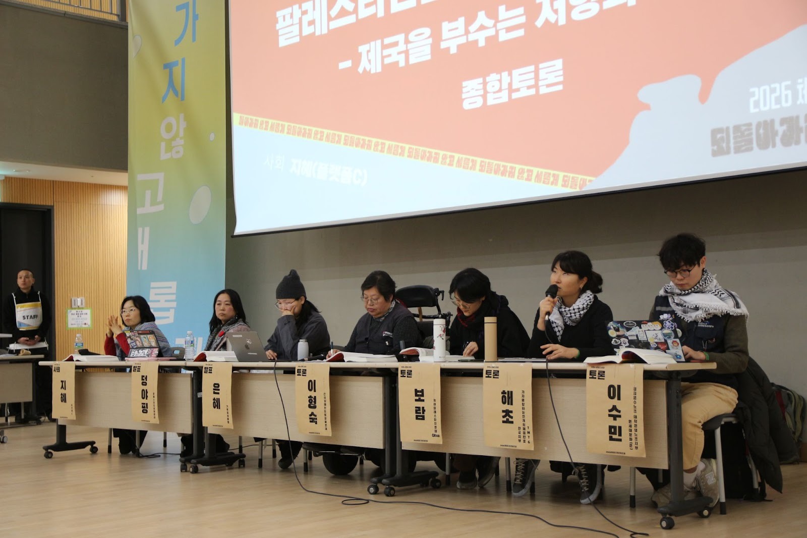 (팔레스타인 자유세션이 진행 중이다. 사회자와 발제자, 토론자 총 일곱명이 책상에 나란히 앉아있고, 한 명이 마이크를 들고 답변을 하고 있다. 발표자 중 몇은 팔레스타인 저항의 상징인 쿠피예를 목에 두르고 있다. - 사진: 체제전환운동포럼 조직위원회)