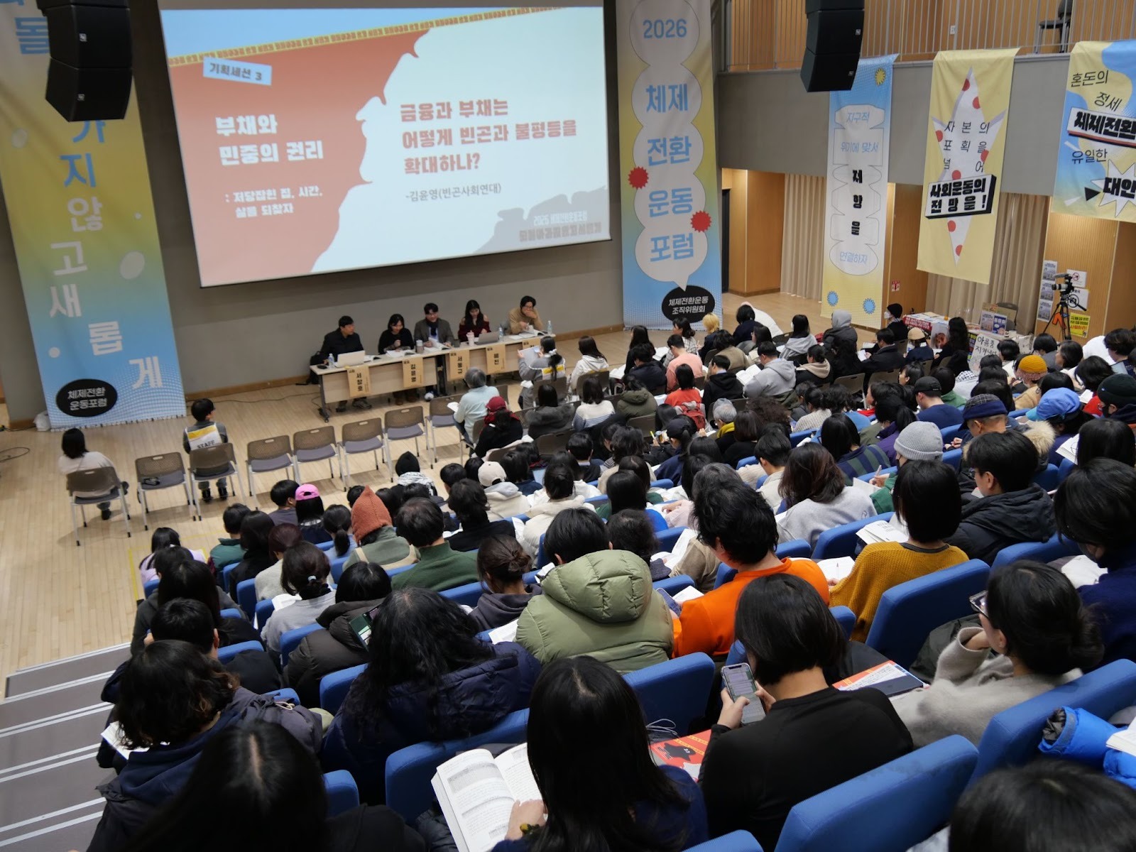 (계단식으로 된 객석 위에서 발표자와 무대를 바라보며 찍은 사진이다. 세션이 진행 중이고, 객석에는 청중들이 가득하다. 무대 벽면에는 “부채와 민중의 권리 - 금융과 부채는 어떻게 빈곤과 불평등을 확대하나?”라는 제목의 피피티가 송출 중이다. 다섯 명의 발표자가 책상에 앉아 있다. - 사진: 체제전환운동포럼 조직위원회)