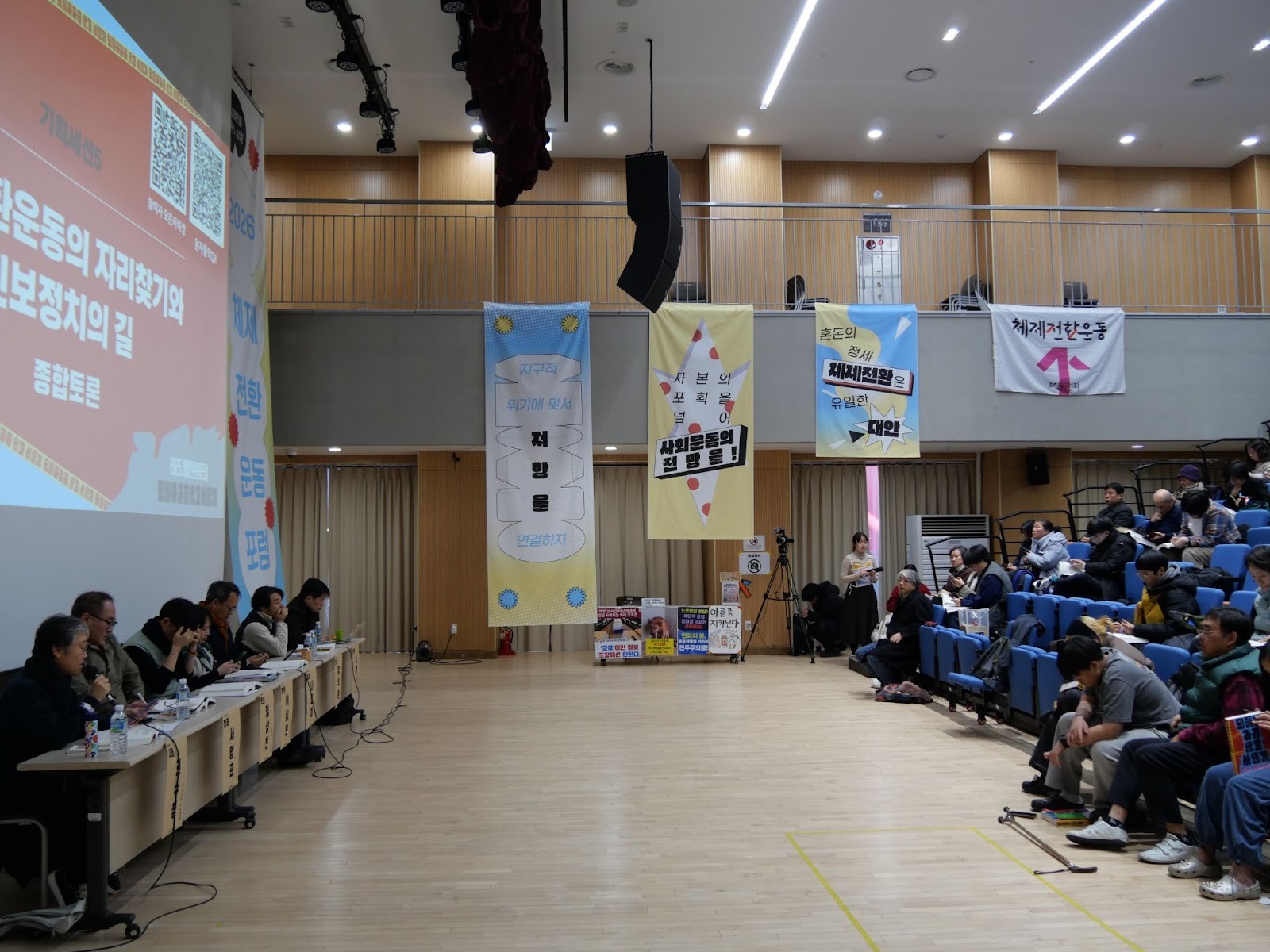 (진보정치 세션의 발표자와 청중을 함께 찍은 사진이다. 복도로 이어지는 벽면에 다양한 현수막이 늘어져있다. “지구적 위기에 맞서 저항을 연결하자”, “자본의 포획을 넘어 사회운동의 전망을!” “혼돈의 정세 체제전환은 유일한 대안” 등의 문구가 쓰여있다. - 사진: 체제전환운동포럼 조직위원회)