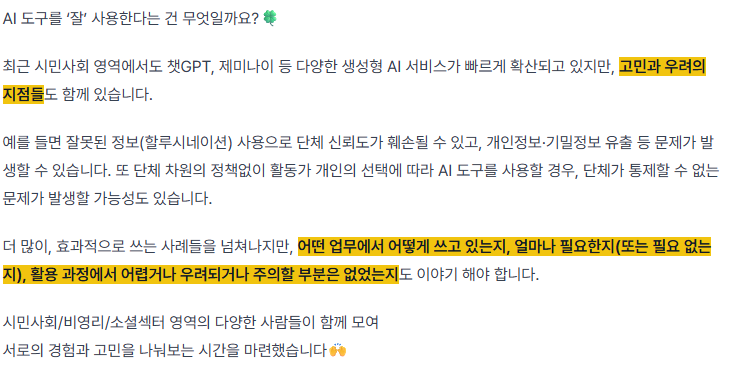 - 고연차 활동가들은 결과물을 비판적으로 걸러 사용하는 것 같지만, 신규 활동가들은 AI의 답변에 의존 하다보니, 내부 역량이 약화되는 경우도 있는 것 같음.
