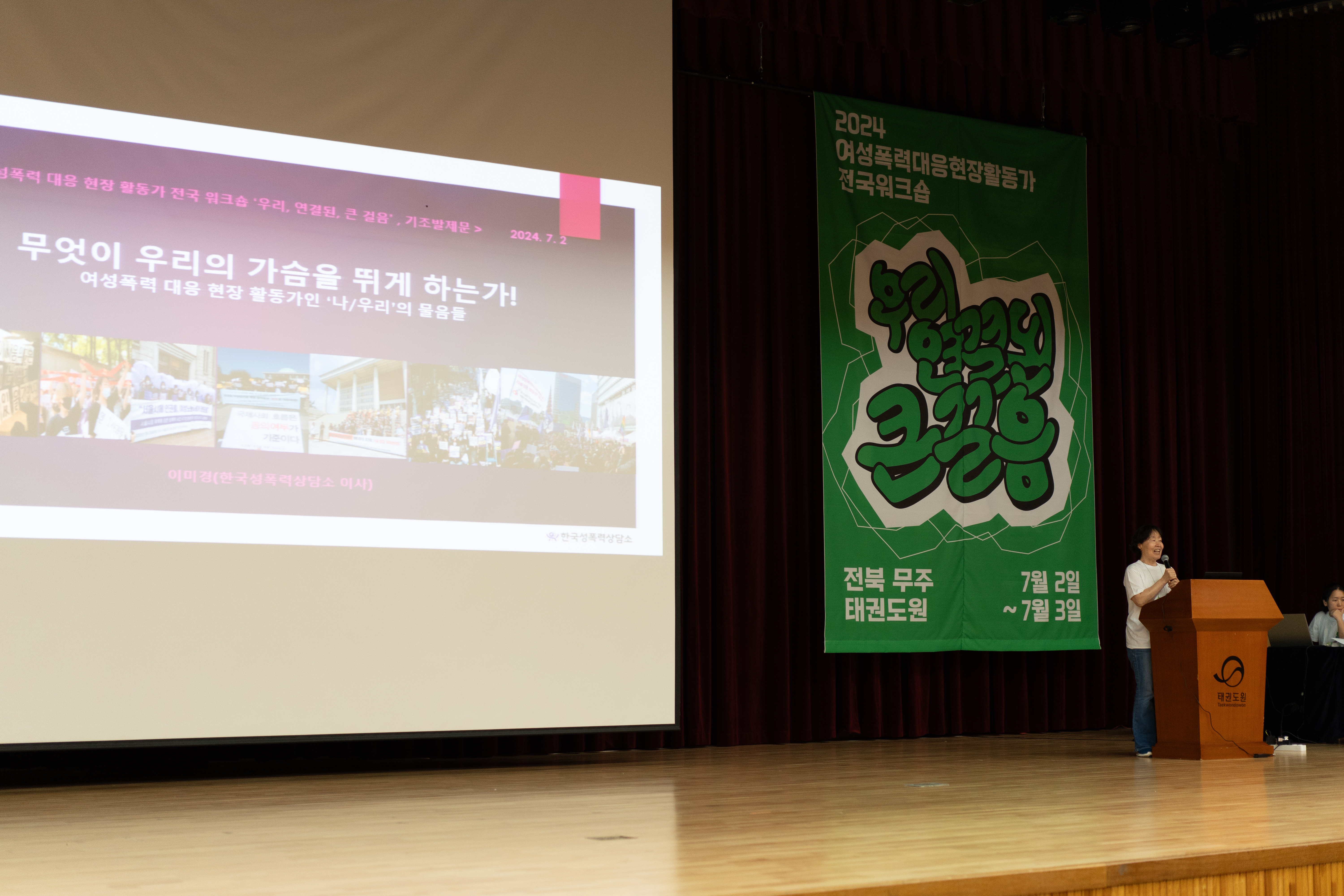 그렇게 만들어진 자리가 바로 <2024 여성폭력 대응 현장활동가 전국 워크숍>이었습니다. 각 단체들을 위기에 빠트린 것이 현 정부인데, 그로 인해 우리는 더욱 가까이 만나 직접 이야기를 나누며 더 강고한 연대를 다질 수 있게 되었다는 것은 아이러니이기는 합니다. 그러나 위기는 곧 기회라고도 했으니, 우리는 지금의 위기를 딛고 더 높이 뛰어오를 준비를 하고 있는 것이겠지요.