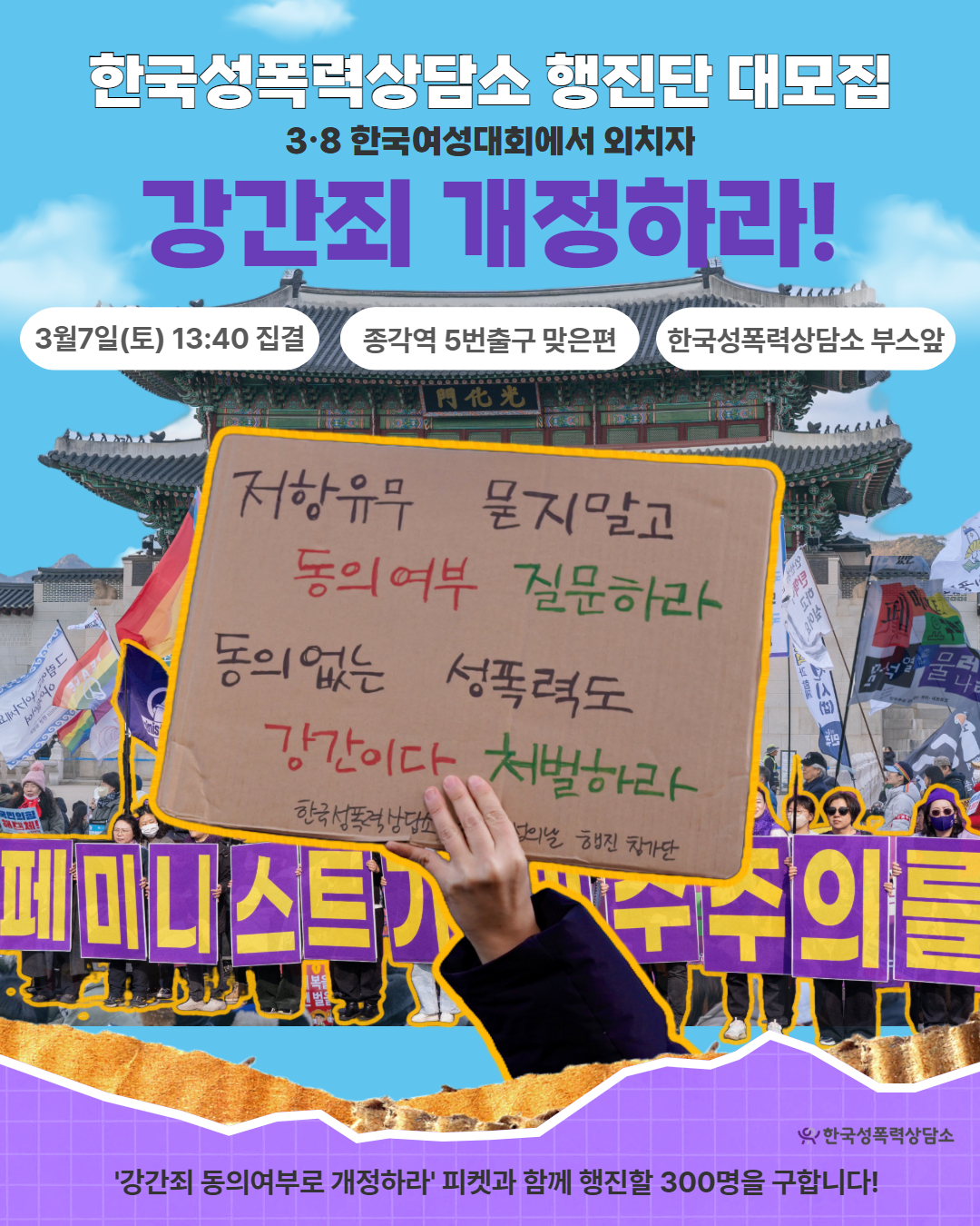 [모집] 3·8 한국여성대회에서 🥖'강간죄 개정하라!' 함께 외칠 행진단 대모집🌹