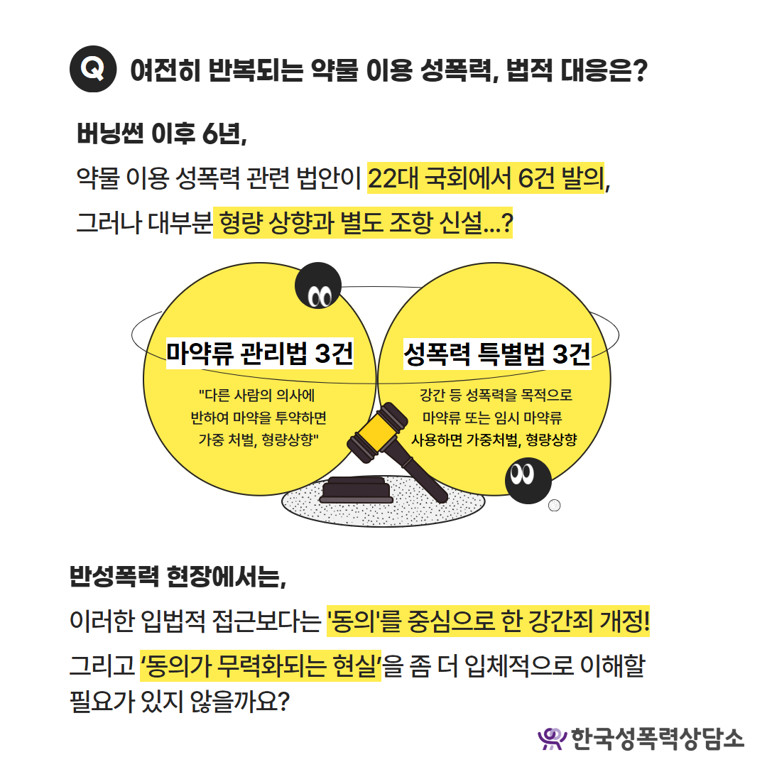 버닝썬 이후 6년이 지났지만, 약물을 이용한 성폭력은 여전히 반복되고 있습니다. 법·제도적 대응이 존재하지만, 약물로 인해 동의가 무력화되는 현실에 대한 입체적 논의가 충분히 이루어지고 있는지 질문해볼 필요가 있습니다.