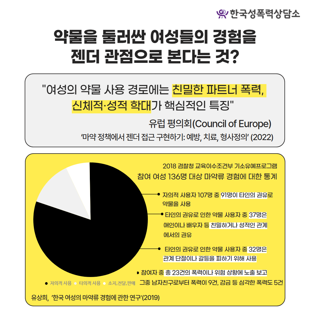 "2018 검찰청 교육이수조건부 기소유예 프로그램 참여 여성 136명 대상 마약류 경험에 대한 통계에 따르면, 자의적 사용자 107명 중 91명이 타인의 권유로 약물을 사용했고, 그 중 37명은 애인이나 배우자 등 친밀하거나 성적인 관계에서의 권유로 사용. 또한 32명은 사용 동기로 관계 단절이나 갈등을 피하기 위해 사용했다고 답했습니다. 또한 총 참여자 중 32건에서 폭력이나 위험 상황에 대한 노출이 확인되었고, 그 중 남자친구로부터의 폭력이 9건, 감금 등 심각한 폭력도 5건(중복 집계) 있었습니다"
