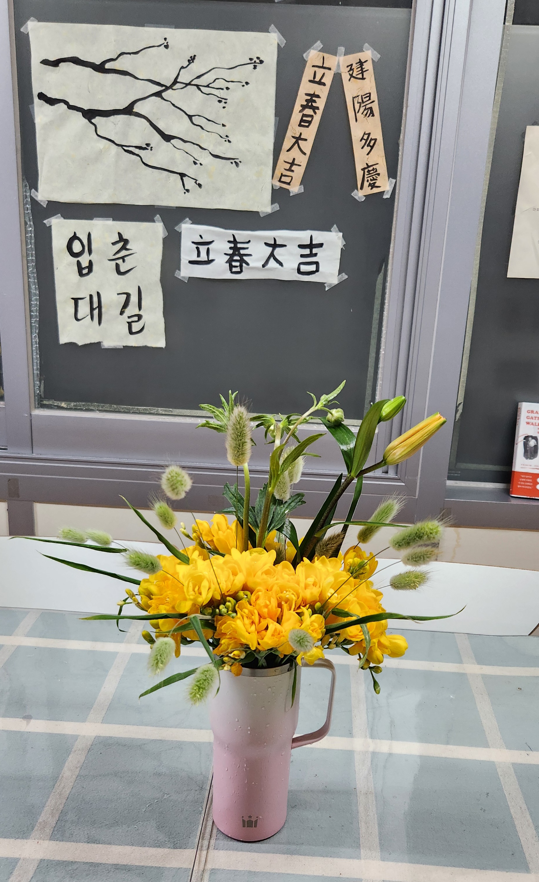 또우리모임에 참석한 활동가들이 만든 꽃다발은 열림터 거실에 자리를 잡았어요. 차를 마시던 텀블러에 한가득 담긴 꽃을 보면서 생활인들도 봄기운을 느끼고 있습니다. |