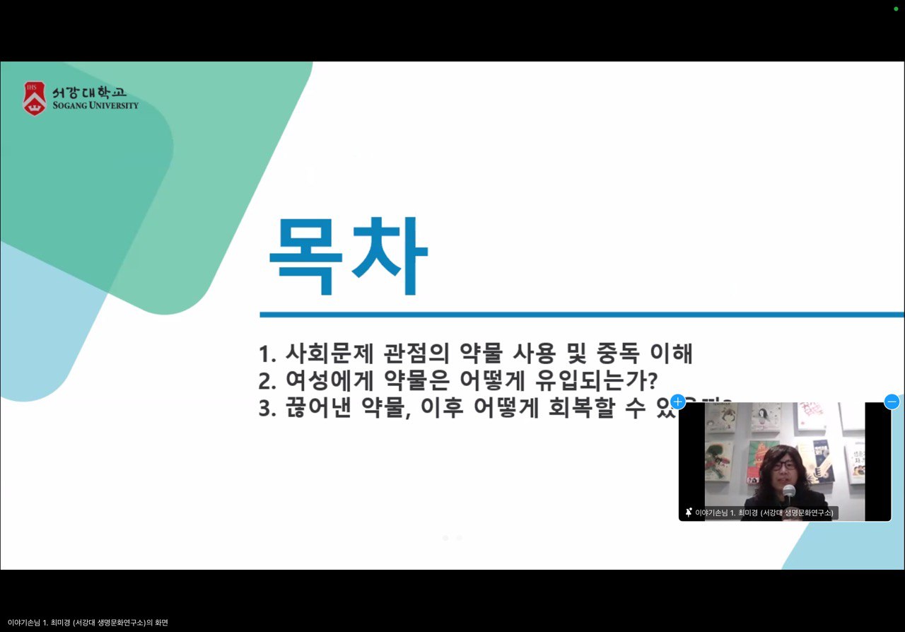 이야기 손님 1 최미경 선생님이 약물에 연루되는 여성들을 주제로 발제하고 있다.