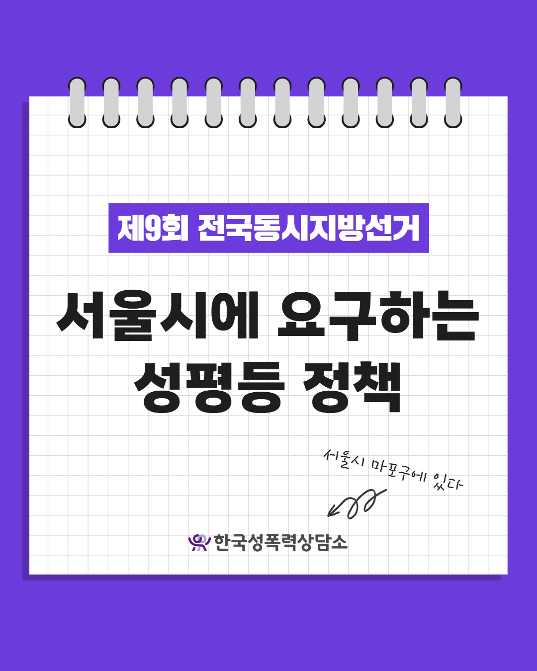 (서울시 마포구에 있는) 한국성폭력상담소가 💜 제9회 전국동시지방선거를 맞아 서울시에 요구하는 성평등 정책! ✊🗳