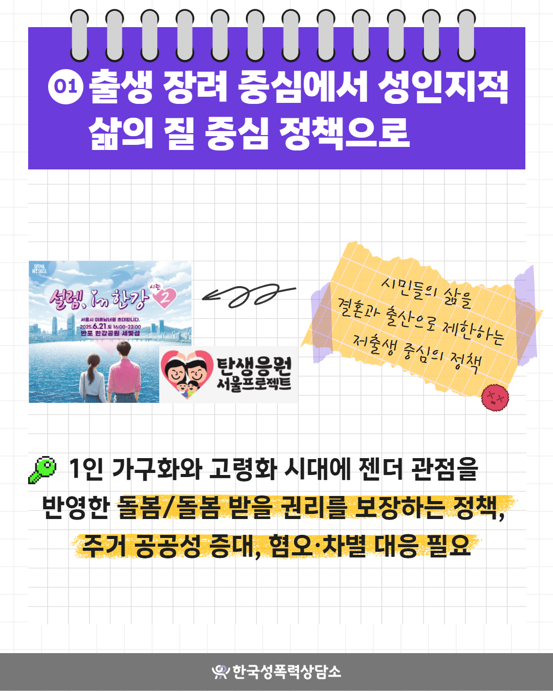 😵"설렘, in 한강", "탄생응원서울프로젝트"와 같은 시민들의 삶을 결혼과 출산으로 제한하는 저출생 중심의 정책