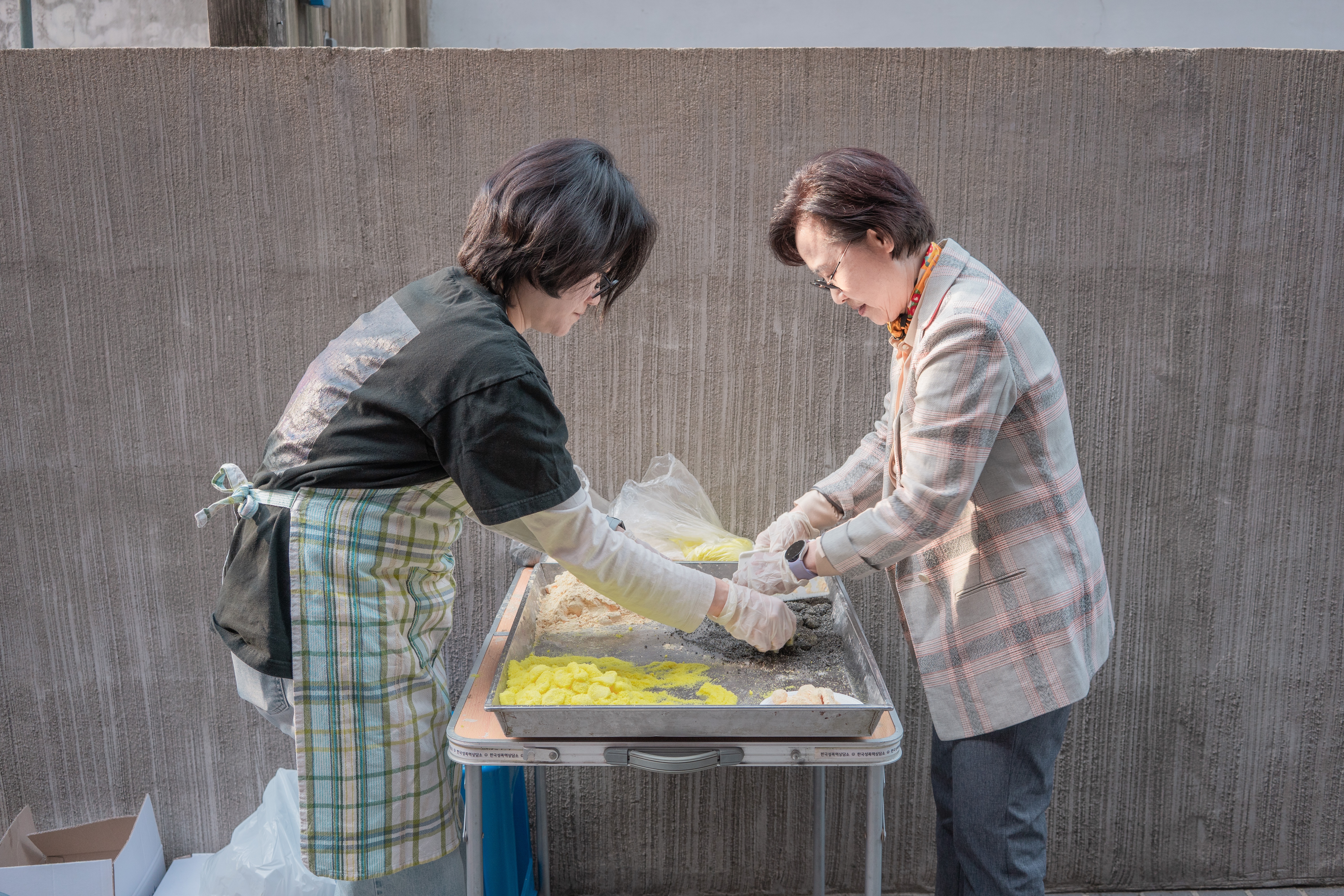 (사진설명) 활동가와 이사장님이 나란히 서서 떡을 자르고 고물을 묻히고 있다