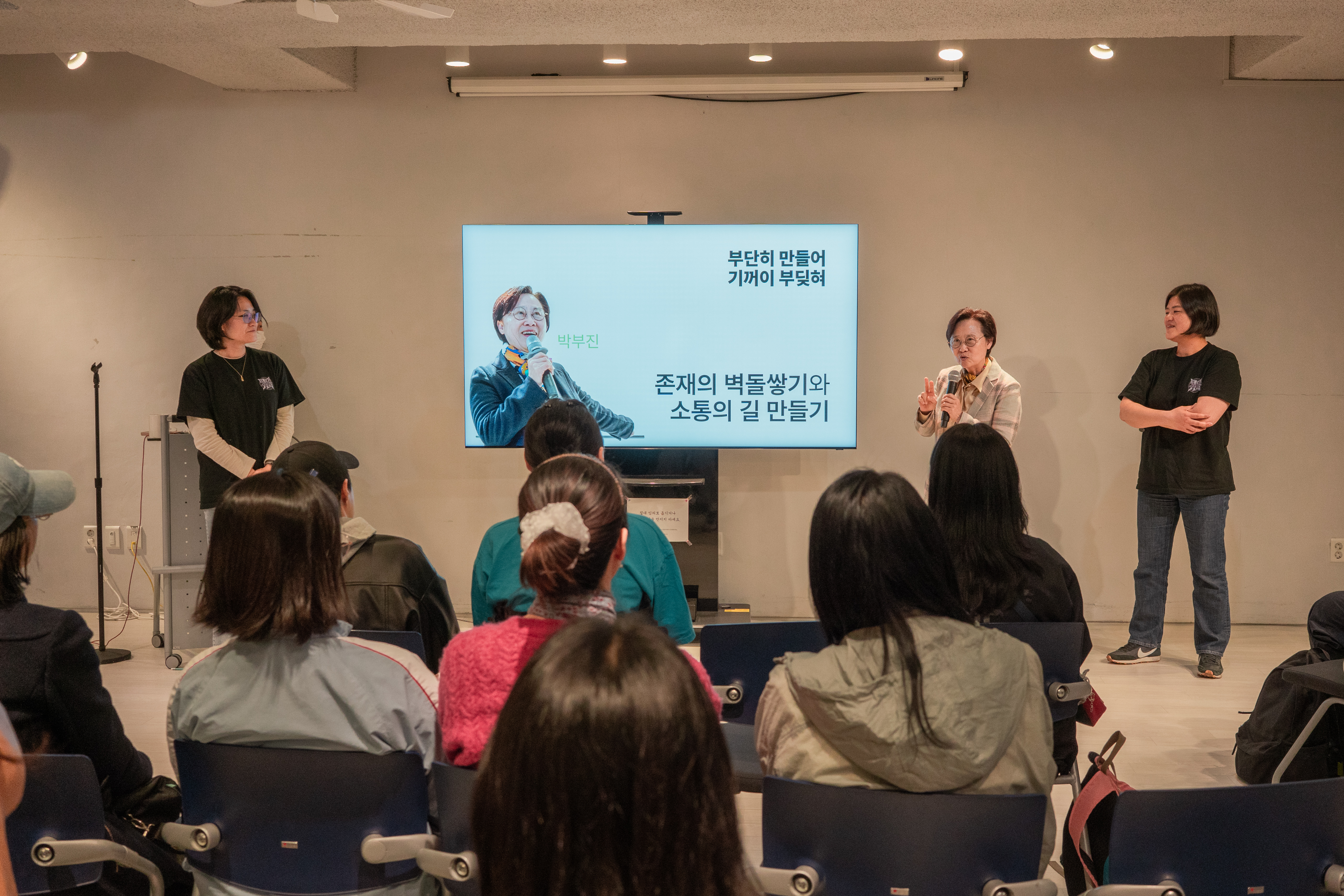 (사진설명) 란, 오매 활동가와 박부진 이사장님이 손님들의 앞에 서있다. TV 모니터에 "존재의 벽돌싸기와 소통의 길 만들기"라고 적혀있다.