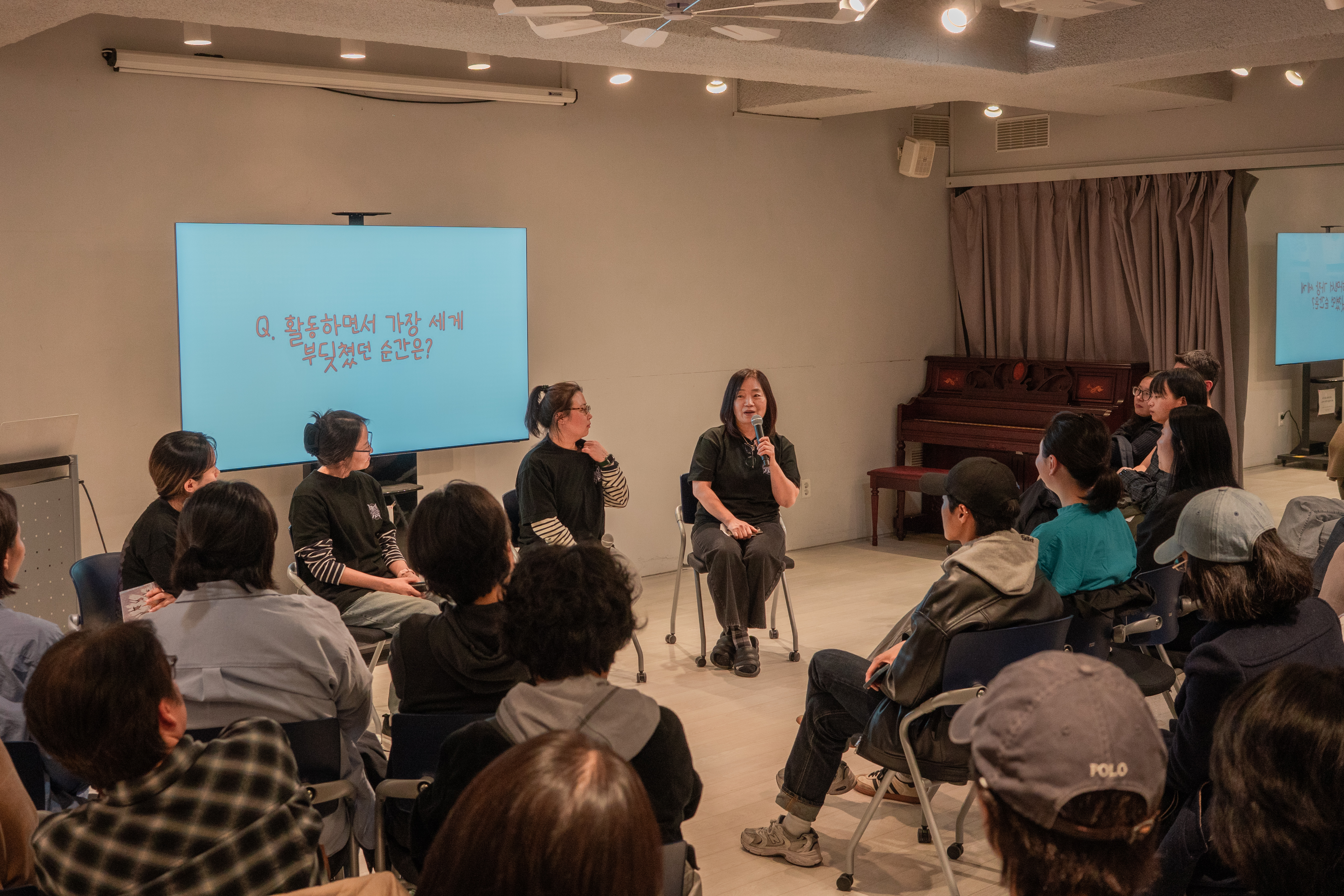 (사진설명) 관객들의 앞에 4명의 활동가가 앉아있다. 이중 한명의 활동가가 마이크를 잡고 있고, TV모니터에 "활동하면서 가장 세게 부딪쳤던 순간은?" 이라고 적혀있다.