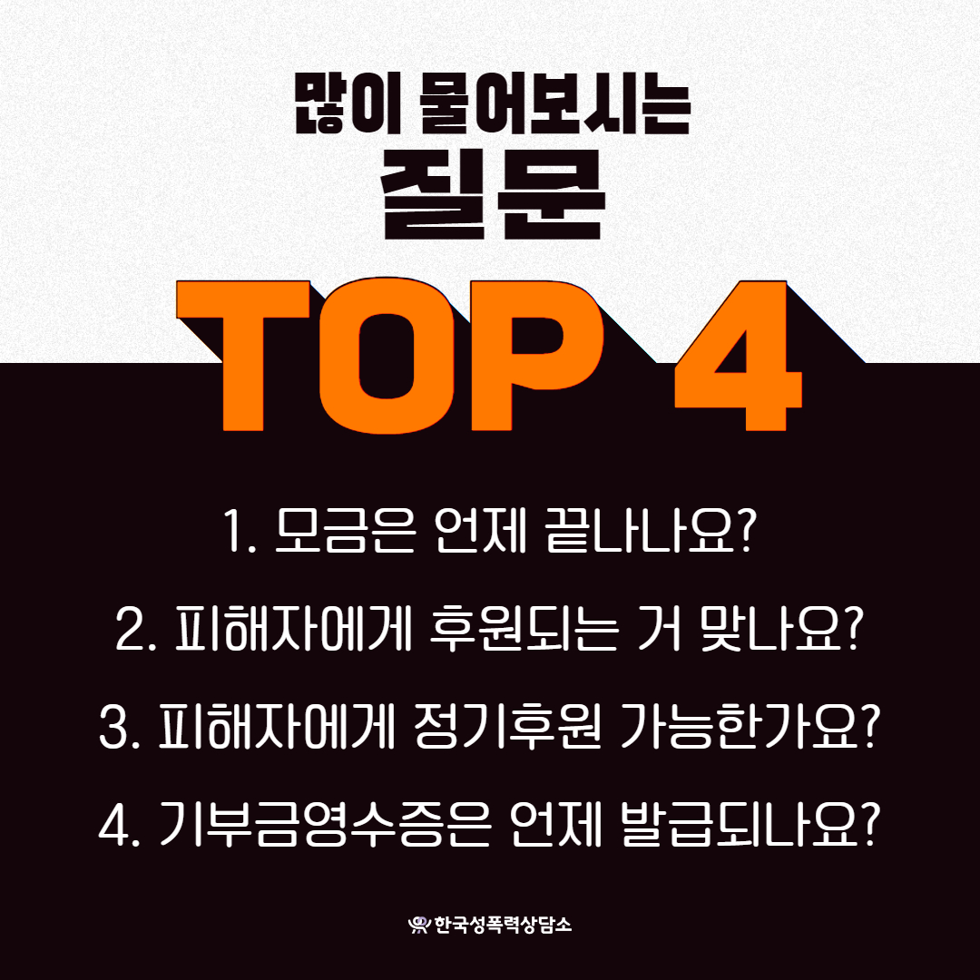 후원금 결제 전, 이 문구 기억하시나요? 성폭력피해자 지원단체인 한국성폭력상담소에는 형사처분, 징계 감경 등 면피 목적 가해자 후원이 많이 들어옵니다. 후원금이 가해자 처벌을 약하게 하는 상황을 방지하고자 기부금영수증은 연중 1회, 1월 초 국세청 홈택스에 일괄 발급하고 있습니다.(모금함에도 관련 내용을 적어두었습니다.) 혹시 긴급한 사유로 기부금영수증이 필요한 경우 회원홍보팀(f.member@sisters.or.kr)로 문의 주세요.