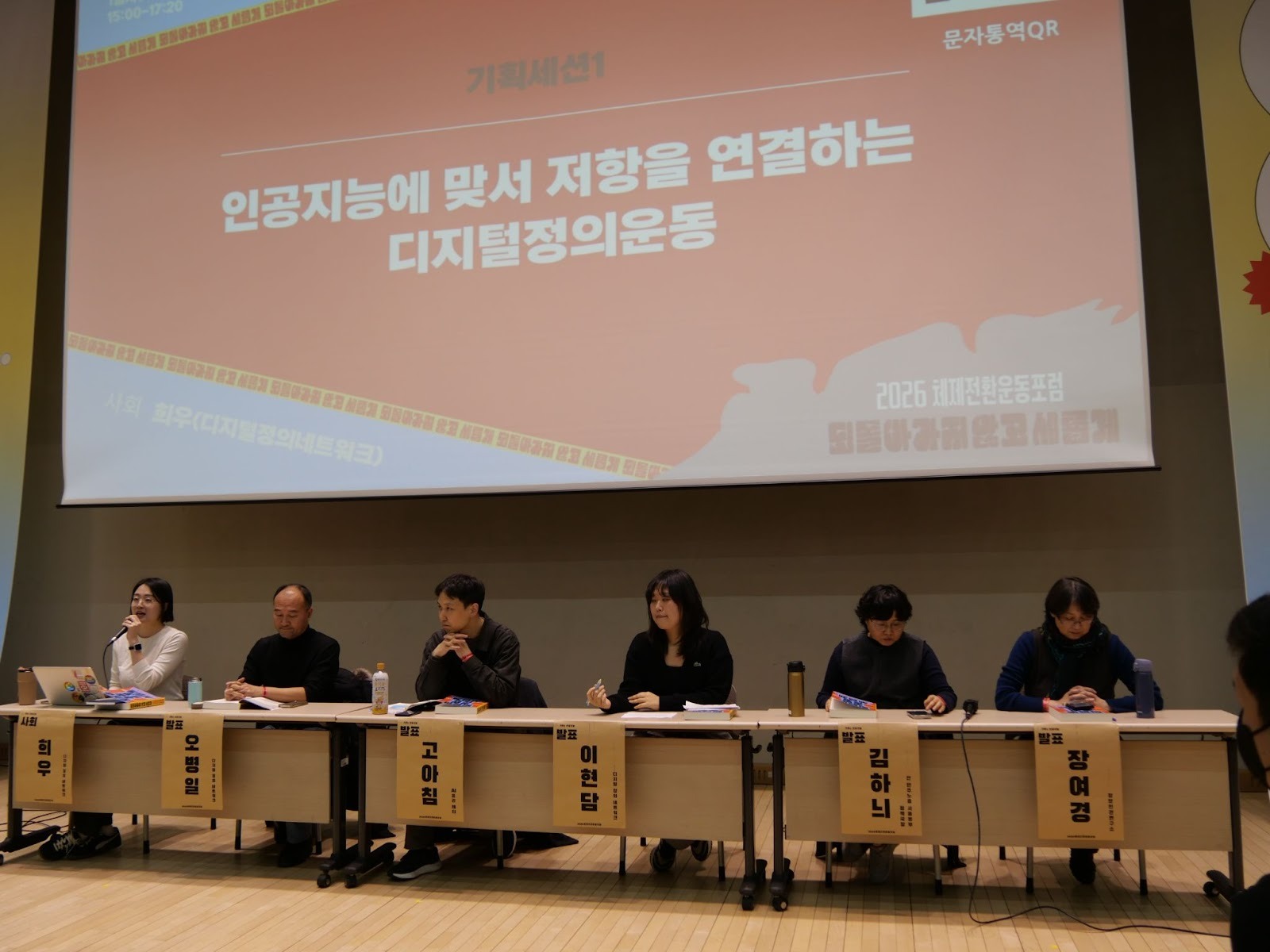 (기획세션 발표 모습이다. 여섯 명의 사람들이 나란히 앉아있다. 사회자가 마이크를 들고 이야기 중이다. 앉아있는 사람 뒤에는 ‘기획세션 1. 인공지능에 맞서 저항을 연결하는 디지털정의운동’이라고 쓰여 있다. - 사진: 체제전환운동포럼 조직위원회)