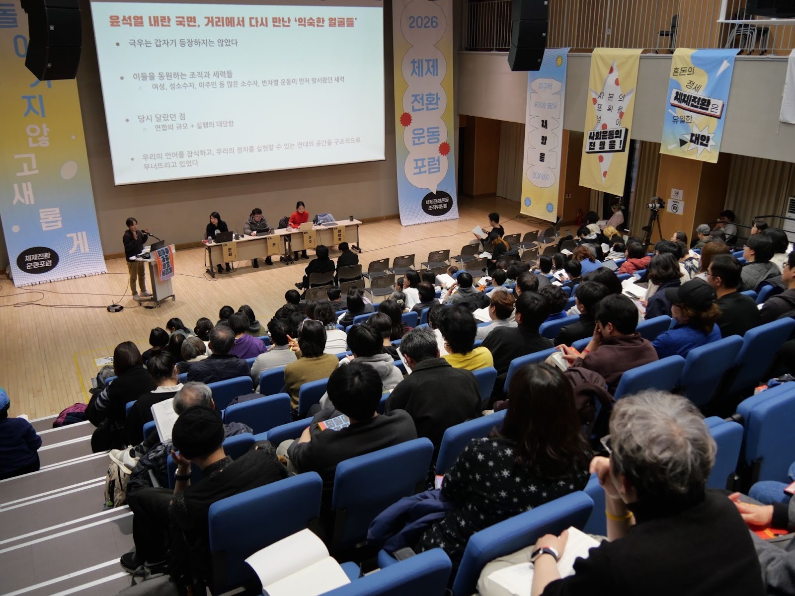 (계단식으로 된 객석 위에서 발표자와 무대를 바라보며 찍은 사진이다. 객석에는 청중들이 가득하다. 무대 오른편에는 2026 체제전환운동포럼이라고 쓰인 세로로 긴 현수막이 있다. 발표자 한 명이 서서 발제 중이고, 나머지 세 명은 책상에 앉아 있다. 화면에는 “‘윤석열 내란 국면, 거리에서 다시 만난 ‘익숙한 얼굴들’”이라는 제목의 피피티가 송출 중이다. - 사진: 체제전환운동포럼 조직위원회)