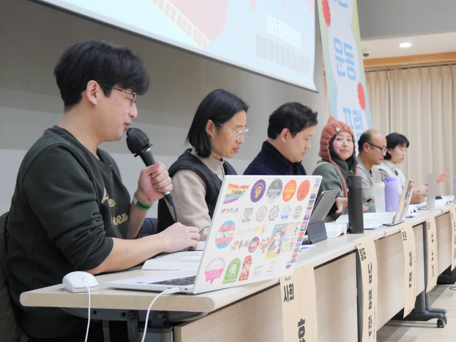 (지역정의 세션의 발표자들을 왼편에서 찍은 사진이다. 맨 왼쪽에 앉아있는 사회자가 마이크를 들고 뭔가 말하고 있다. 사회자의 노트북에 많은 스티커가 붙어 있다. 그 뒤로 다섯 명의 발표자들이 나란히 앉아 있다. - 사진: 체제전환운동포럼 조직위원회)