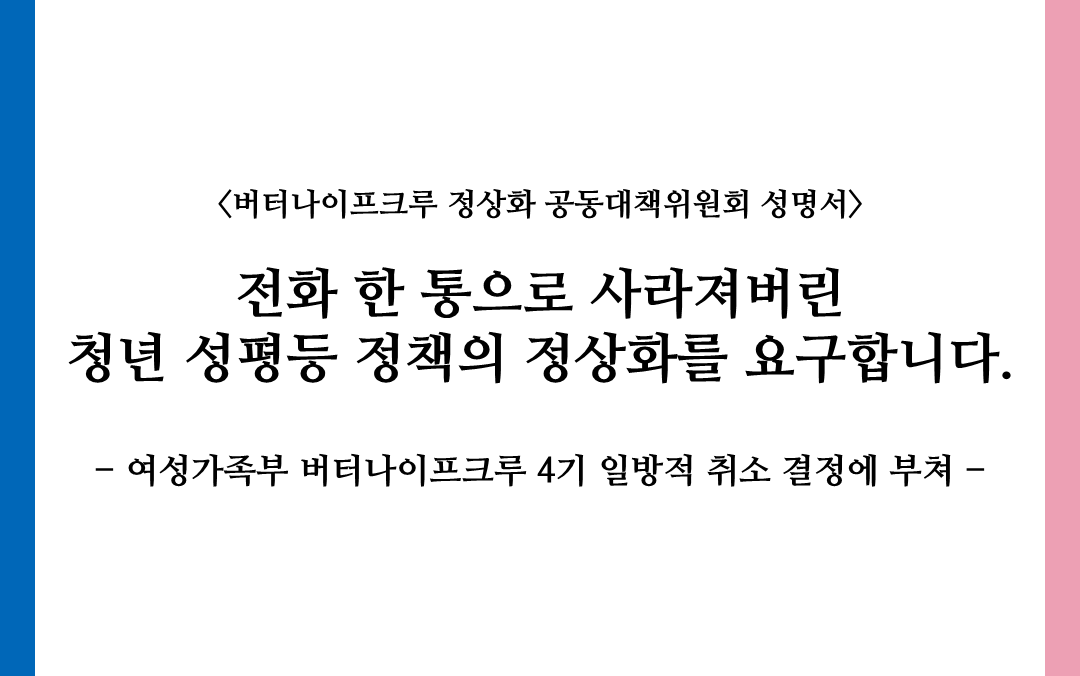청년성평등문화추진단 '버터나이프크루' 4기를 일방적으로 취소 결정한 여성가족부와 김현숙 장관을 규탄하며, 버터나이프크루 정상화를 위한 지지단체로서 연대합니다. 💪지지 서명하기?...- 2022-08-18