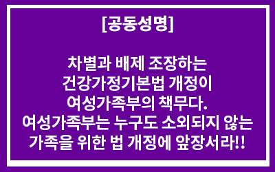 [공동성명] 차별과 배제 조장하는 건강가정기본법 개정이 여성가족부의 책무다. 여성가족부는 누구도 소외되지 않는 가족을 위한 법 개정에 앞장서라!! 언론보도에 따르면 지난 22일...- 2022-09-26
