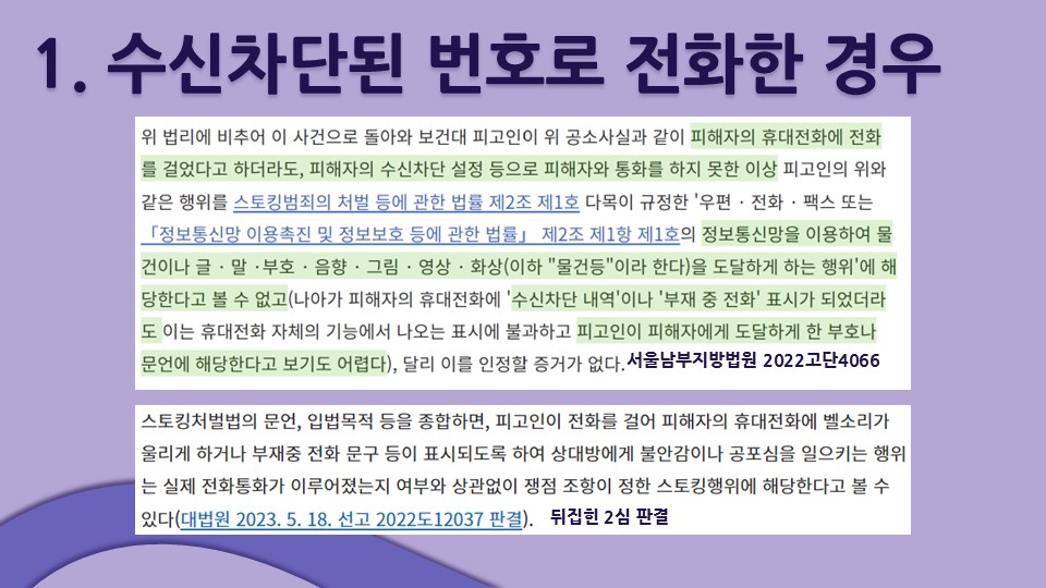 첫째, 피해자가 가해자의 전화번호를 수신차단하여 실제로 벨소리나 진동 등 알림이 울리지는 않았으나 '수신차단 내역'이나 '부재 중 전화'로 표시된 사건의 경우, 1심은 실제 전화통화가 없었다는 이유로 무죄를 선고했으나 2심은 '상대방에게 불안감이나 공포심을 일으키는 행위는 실제 전화통화가 이루어졌는지 여부와 상관 없이 쟁점 조항이 정한 스토킹행위에 해당한다'는 대법원 판례를 인용하며 유죄로 뒤집었습니다.