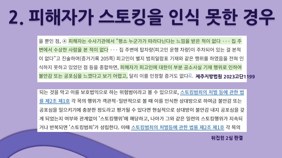 둘째, 가해자가 피해자를 따라다니고 감시하는 등 스토킹행위를 했으나 피해자가 그러한 사실을 인식하지 못했던 사건의 경우, 1심은 피해자가 불안감 또는 공포심을 느꼈다고 보기 어렵다는 이유로 무죄를 선고했으나, 2심은 '해당 행위가 객관적·일반적으로 볼 때 이를 인식한 상대방으로 하여금 불안감 또는 공포심을 일으키기에 충분한 정도라고 평가될 수 있다면 현실적으로 상대방이 불안감 내지 공포심을 갖게 되었는지 여부와 관계 없이 '스토킹행위'에 해당'한다며 유죄로 뒤집었습니다.