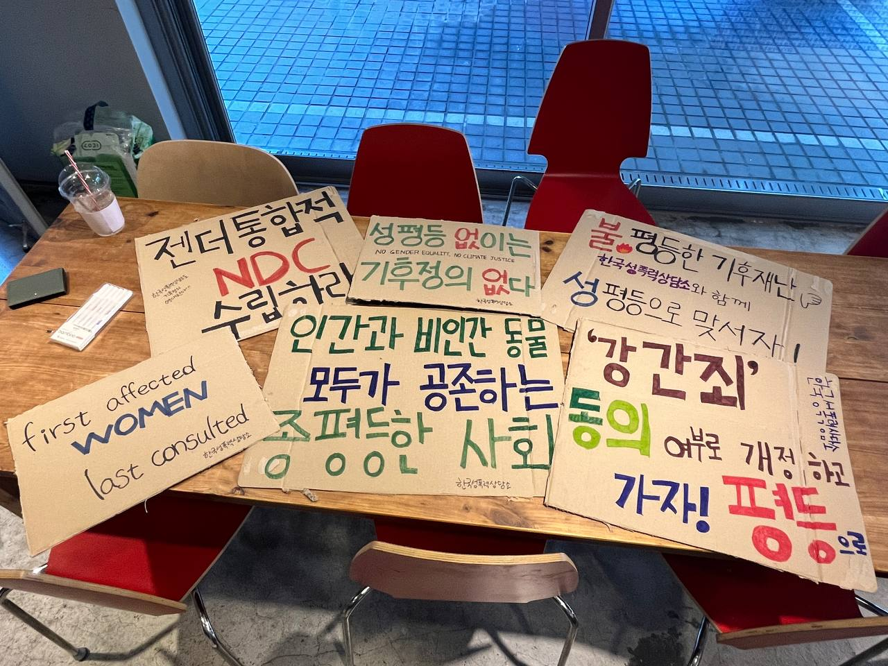 사전 워크숍으로피켓만들기를 진행했습니다. 최근 녹색전환연구소, 여성환경연대, 플랜 1.5와 함께 <2025 NDC 젠더 관점 워크숍>(후기보기) 에 참여한 동은 활동가가 만든 피켓입니다.