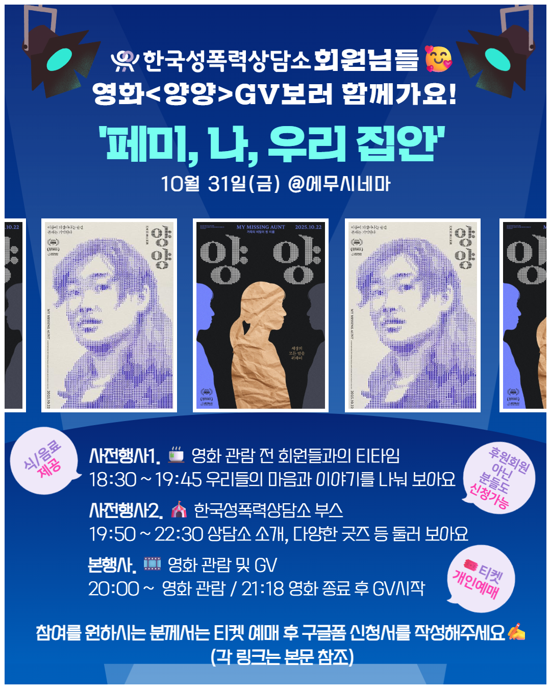 멋진 페미니스트 감독님들의 영화가 연달아 개봉한 풍요로운 11월이었습니다. 저는 <세계의 주인>과 <양양>을 보았는데요. 두 영화 모두 깊은 고민을 가진 감독님들의 메시지가 큰 울림을 주었습니다. 여기서는 한국성폭력상담소 회원님들과 함께 본 <양양>GV에 다녀온 소감을 살짝 들려드릴게요.