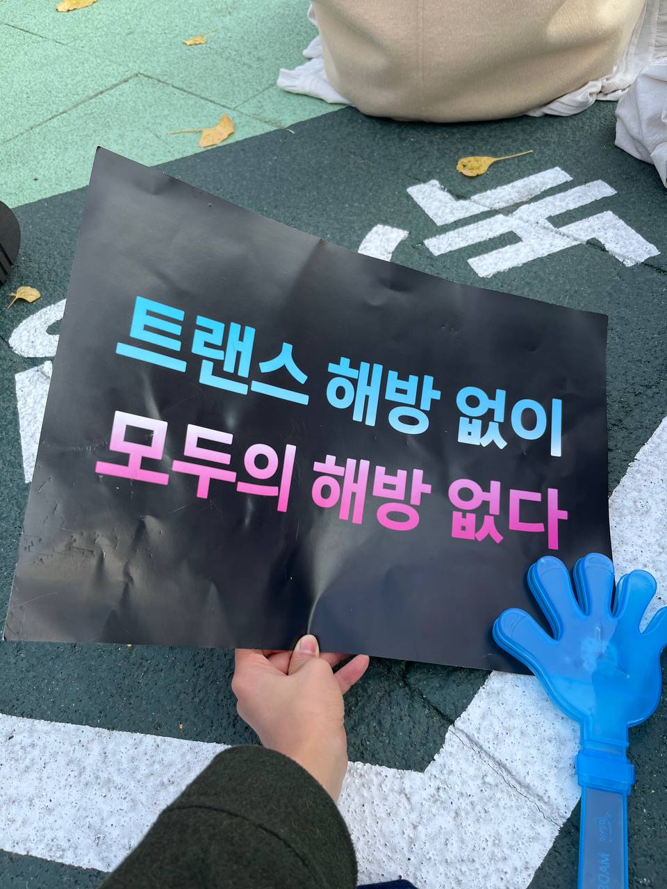 현장의 참여자분이 직접 인쇄해온 피켓 "트랜스 해방 없이 모두의 해방 없다"라고 적혀있다.