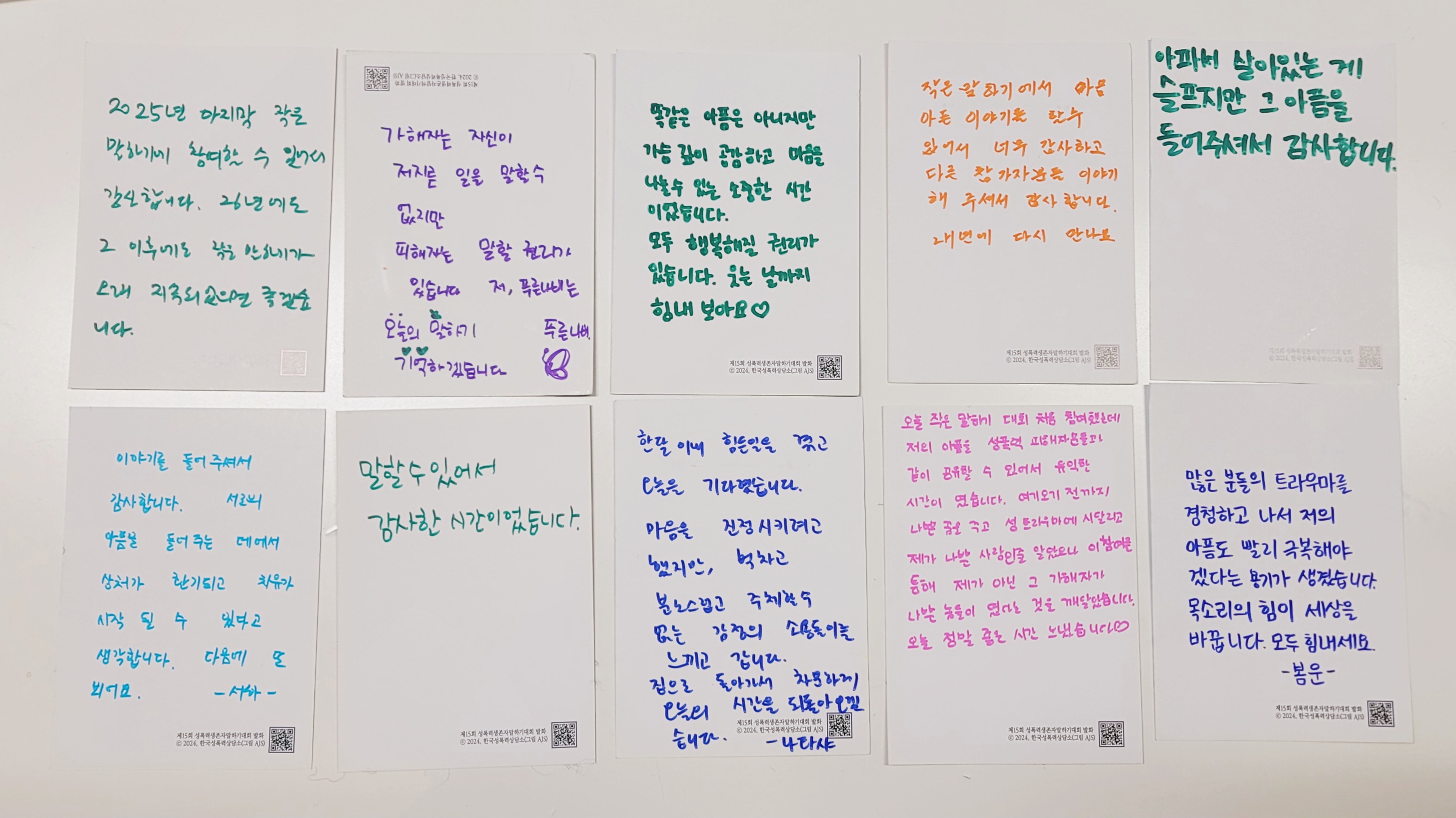 서로의 아픔을 들어주는 데에서 상처가 환기되고 치유가 시작될 수 있다고 생각합니다.