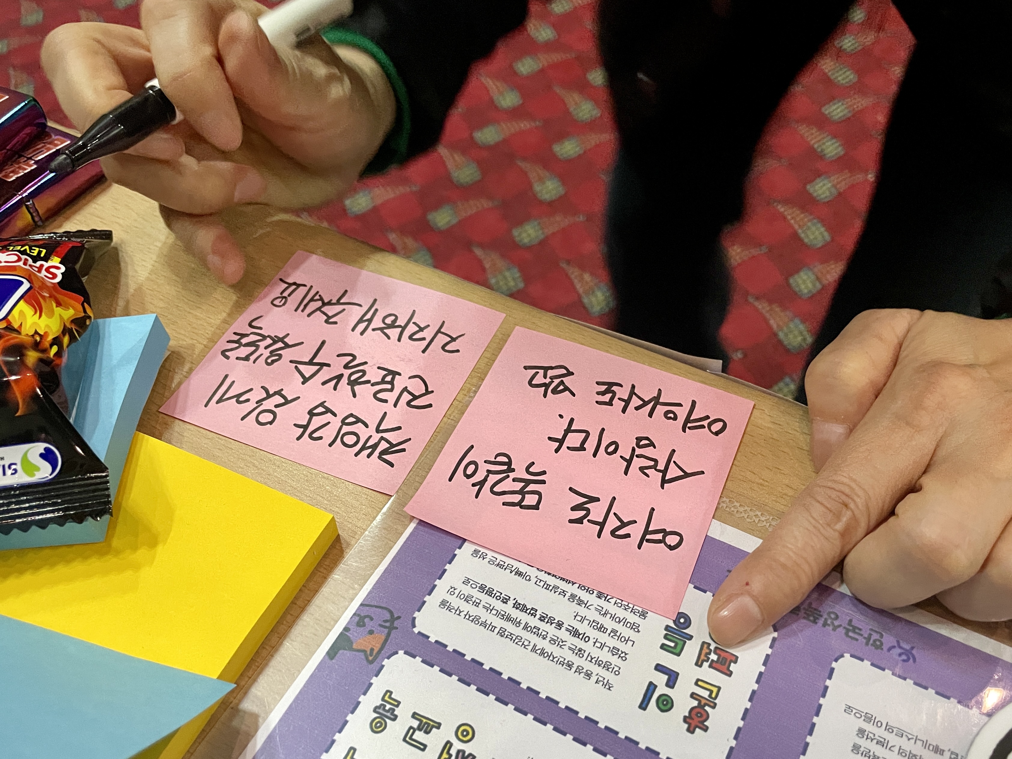 부순 라면을 콰삭콰삭 먹으며 구겨진 포스트잇을 패널에 붙여주셨어요.