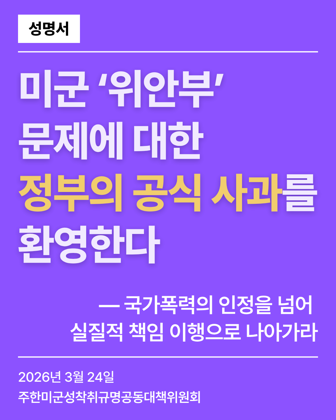 주한미군성착취규명공동대책위원회는 이번 사과가 선언에 그치지 않고, 피해자들의 존엄과 권리를 회복하는 실질적 조치로 이어질 것을 강력히 촉구한다. 국가와 주한미군이 역사적 책임을 분명히 인정하고 이행할 때까지, 우리는 피해자들과 함께 끝까지 함께 할 것이다.