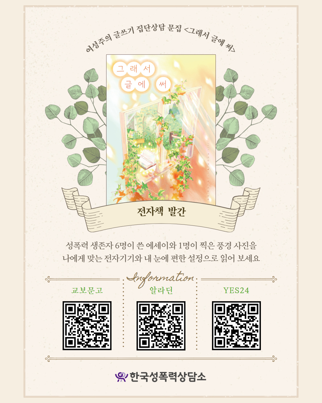 8월 25일, 동명의 제목으로 문집을 발간했습니다. 문집에는 참여자 6명(나무, 전경, 푸른나비, 물, 이제야, 밤가을)이 쓴 글과 참여자 1명(진이)이 찍은 사진들이 실렸습니다. 한국성폭력상담소 홈페이지 자료실에서 PDF로 받아 보실 수 있습니다.