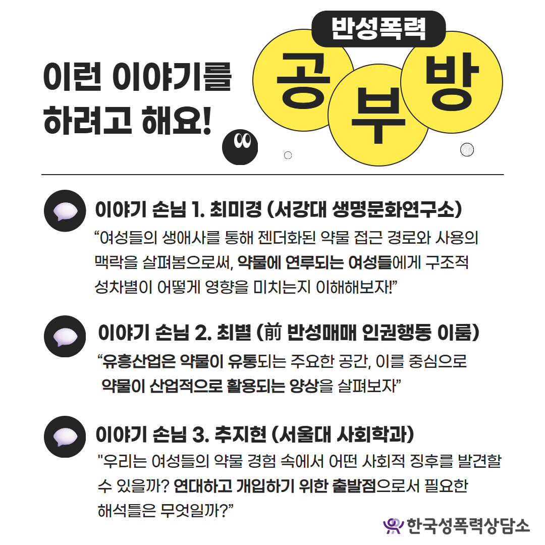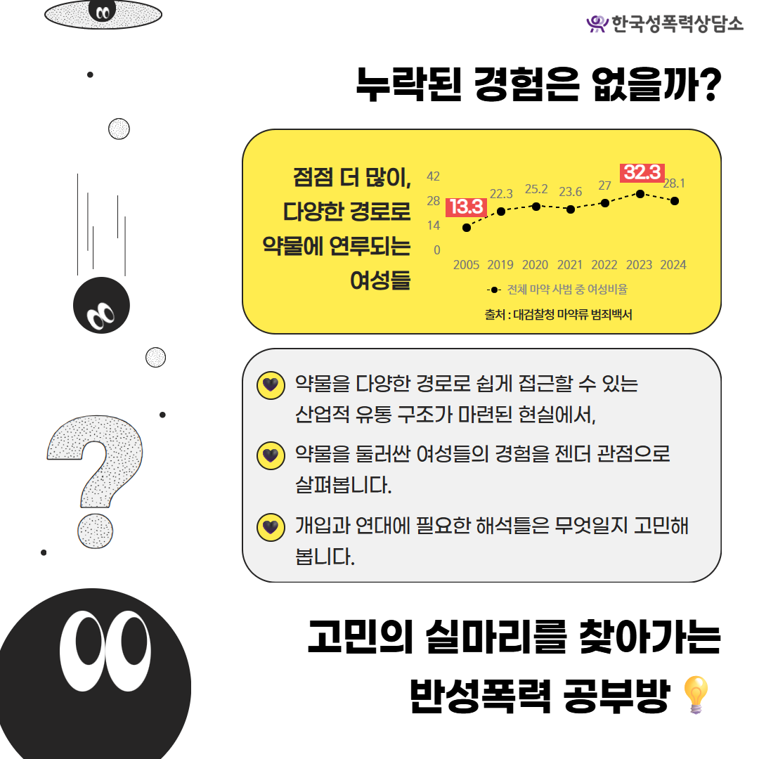 이번 <반성폭력 공부방>에서는 약물, 성차별 구조, 성폭력이 교차하는 지점에서 여성들의 경험을 들여다봅니다. 이를 통해 젠더화된 약물 유입 경로와 경험의 해석 방식을 짚고, 그 위에서 연대와 개입의 새로운 기반을 함께 모색해봅니다🤝