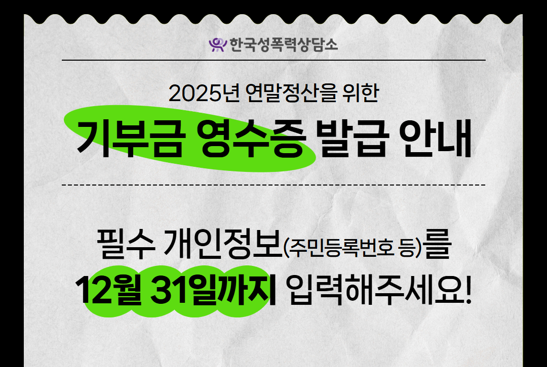 한국성폭력상담소는 지정기부금단체로, 보내주신 후원금에 대하여 2025년 연말정산 시 기부금 세액 공제 혜택을 받으실 수 있습니다.